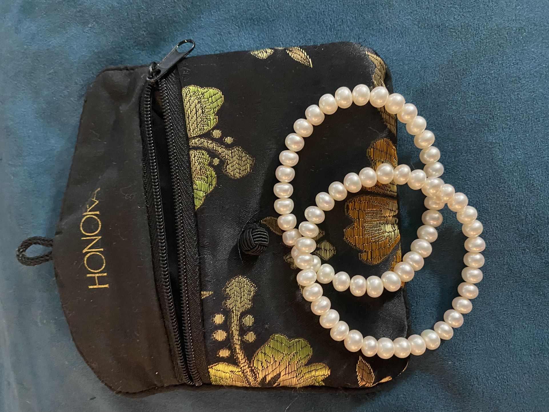 This is a 24” REAL fresh water pearl set. Like new tightly stranded. Includes two stretchy pearl bracelets. They are HONORA Pearls