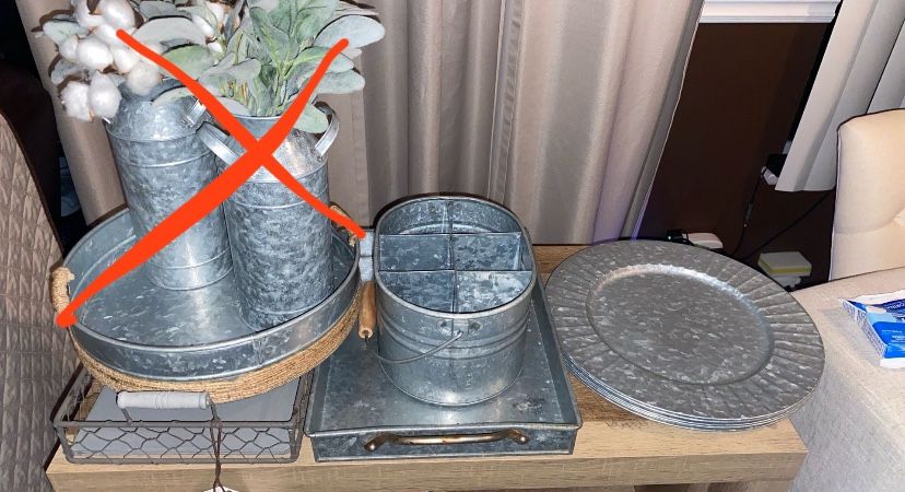 Farmhouse decorations Great material Only used as decorations • 2 rectangular trays •1 round tray •1 6pack drink holder •8 plate chargers •1 heart shape Everything for $40.00 Pet and smoke free home Hablo español ••• 2 milk jars with greenery are SOLD•••