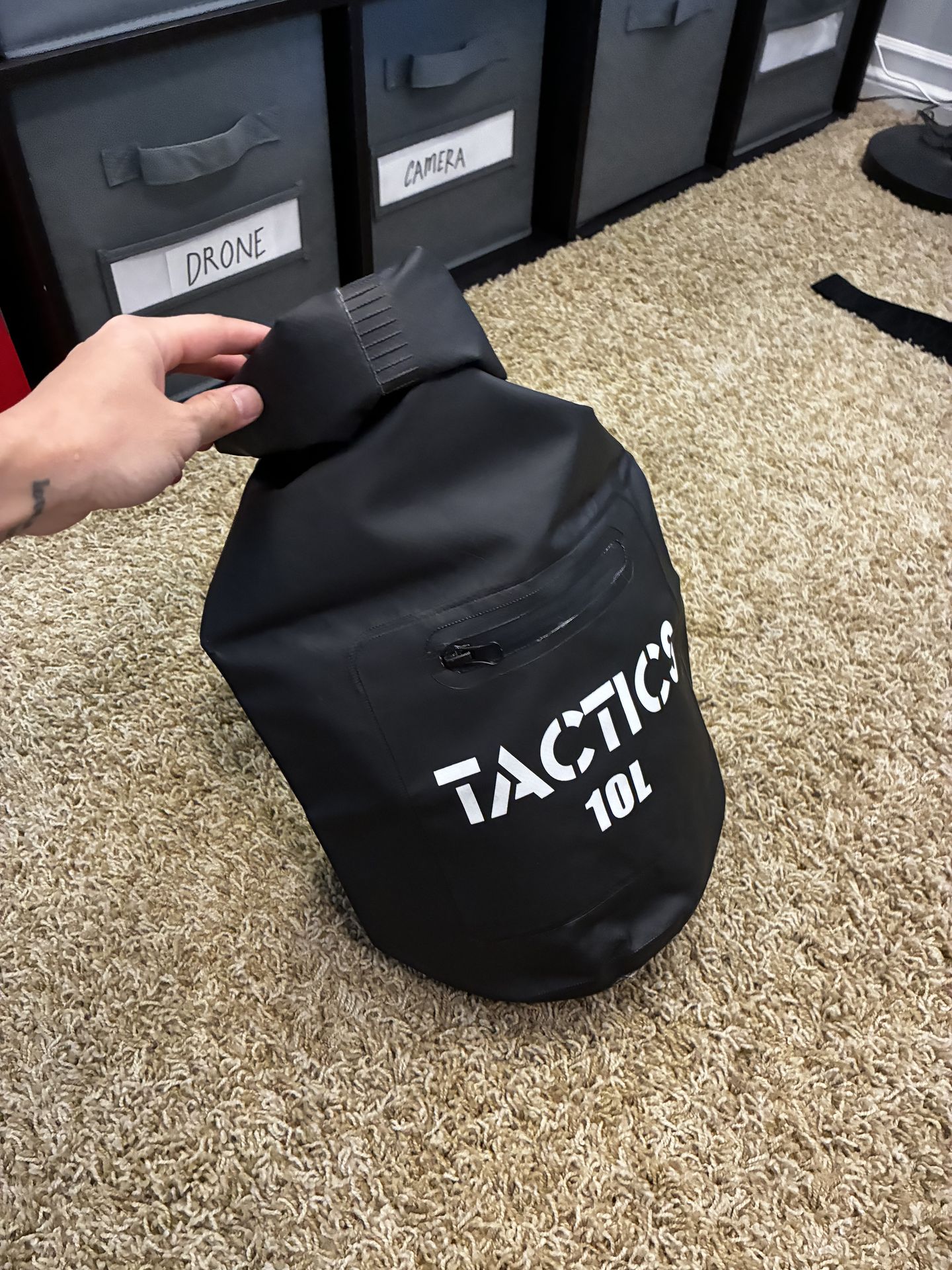 Waterproof TACTICS dry bag. This 10L bag is great for keeping your stuff dry on adventures. Has a shoulder strap too for easy carrying.