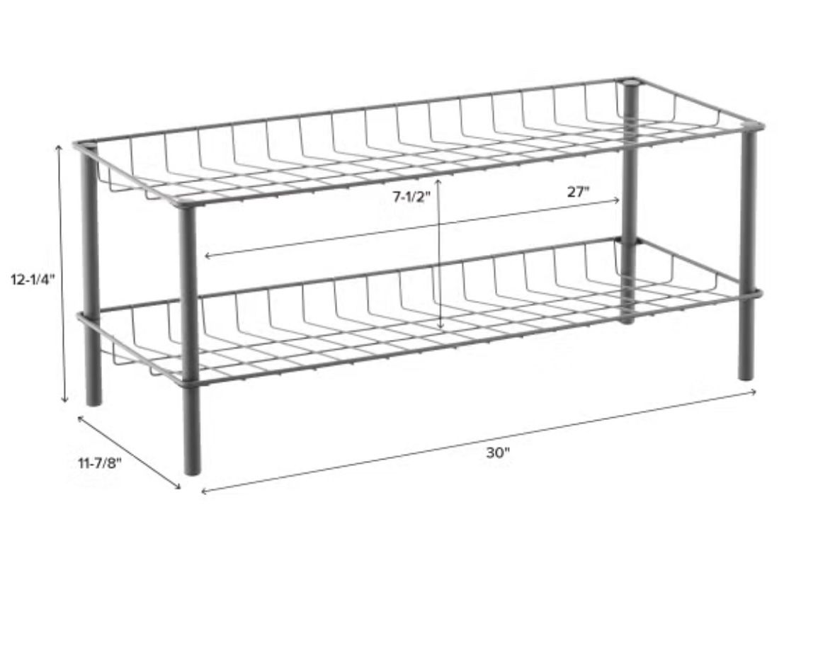 The Container Store Two-Tier Metal Shoe Rack Keep your footwear organized with our sturdy two-tier metal shoe rack, perfect for various spaces and shoe styles. Features, Benefits, and Reasons to Buy: -Made of iron; plastic-capped feet help protect floor surfaces. -Holds up to 6 pairs of men's shoes or 8 pairs of women's shoes. - 7 3/4 inches space between tiers provides ample room for your shoes. - Slip and scratch-resistant feet protect your floor surfaces. -Stylish graphite color complements any décor and adds sophistication to your space. -Only at The Container Store. Length 11-7/8″ Width 30” Height 12-1/4″ *Assembled but didn’t end up using, missed return date. No box.