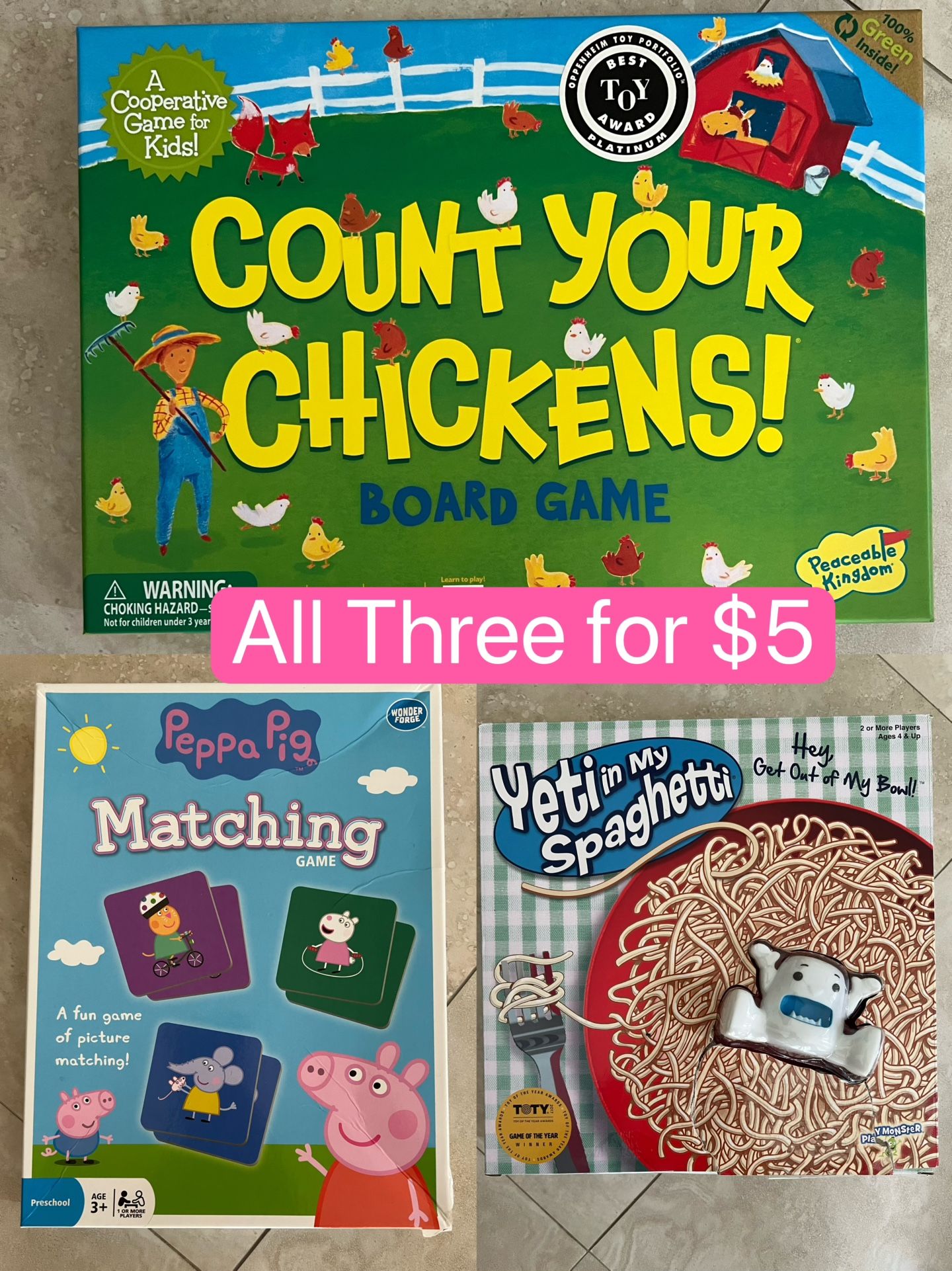 Three board games: Count your chickens, Peppa pig matching game, Yeti in my spaghetti
