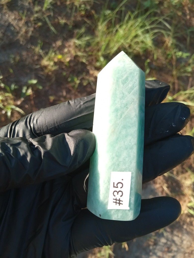 Amazonite crystal tower #35 65 grams /77.4 mm / 3.04" tall Amazonite ☆ Stone of Truth ☆ Stone of Courage ☆ Promotes Balance ☆ Communication ☆ Healing ☆ Fosters Clarity ☆ Divine Feminine ☆ Speak Your Truth ☆ Self Expression ☆ Confidence ☆ Absorb & Block EMF Amazonite is known as the "Stone of Truth" and "Stone of Courage," valued for its ability to promote balance, communication, and healing. It is believed to foster clarity, soothe nerves, balance masculine and feminine energies, and protect against electromagnetic radiation. Historically, it was used in ancient Egypt and by various cultures for its perceived ability to help heal and promote self-expression and inner harmony. Key Meanings & Properties Truth & Courage: Amazonite helps you connect with your true self and find the courage to speak your truth and overcome fears of judgment. Communication & Creativity: It is associated with the throat chakra, which governs communication and self-expression, promoting clarity and confidence in expressing your ideas. Balance & Harmony: The stone is said to bring harmony and balance to your life, helping you align your actions with your values. Healing & Well-being: It offers a soothing, calming energy that can help ease stress, tension, and fatigue. Protection: Amazonite is recognized for its ability to absorb and block electromagnetic radiation (EMF) from electronic devices. Historical Significance Ancient Civilizations: Used in ancient Egyptian rituals and found in the tomb of Tutankhamun, it held significance in spiritual practices and talismans. Legends of Warriors: Some legends attribute its use to the Amazon warrior women, who supposedly adorned their shields with it to gain courage.