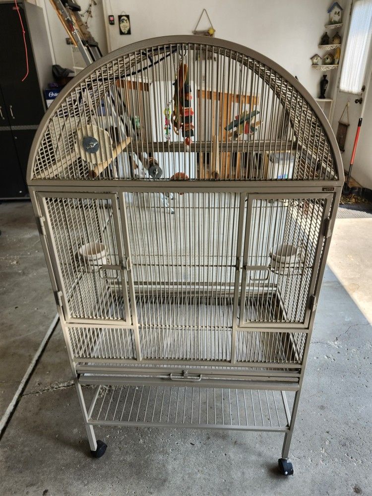 Large birdcage- dimensions are 57" high, 30" wide on rolling casters. Item was lightly used, clean with bird accessories ready for a birds New home.