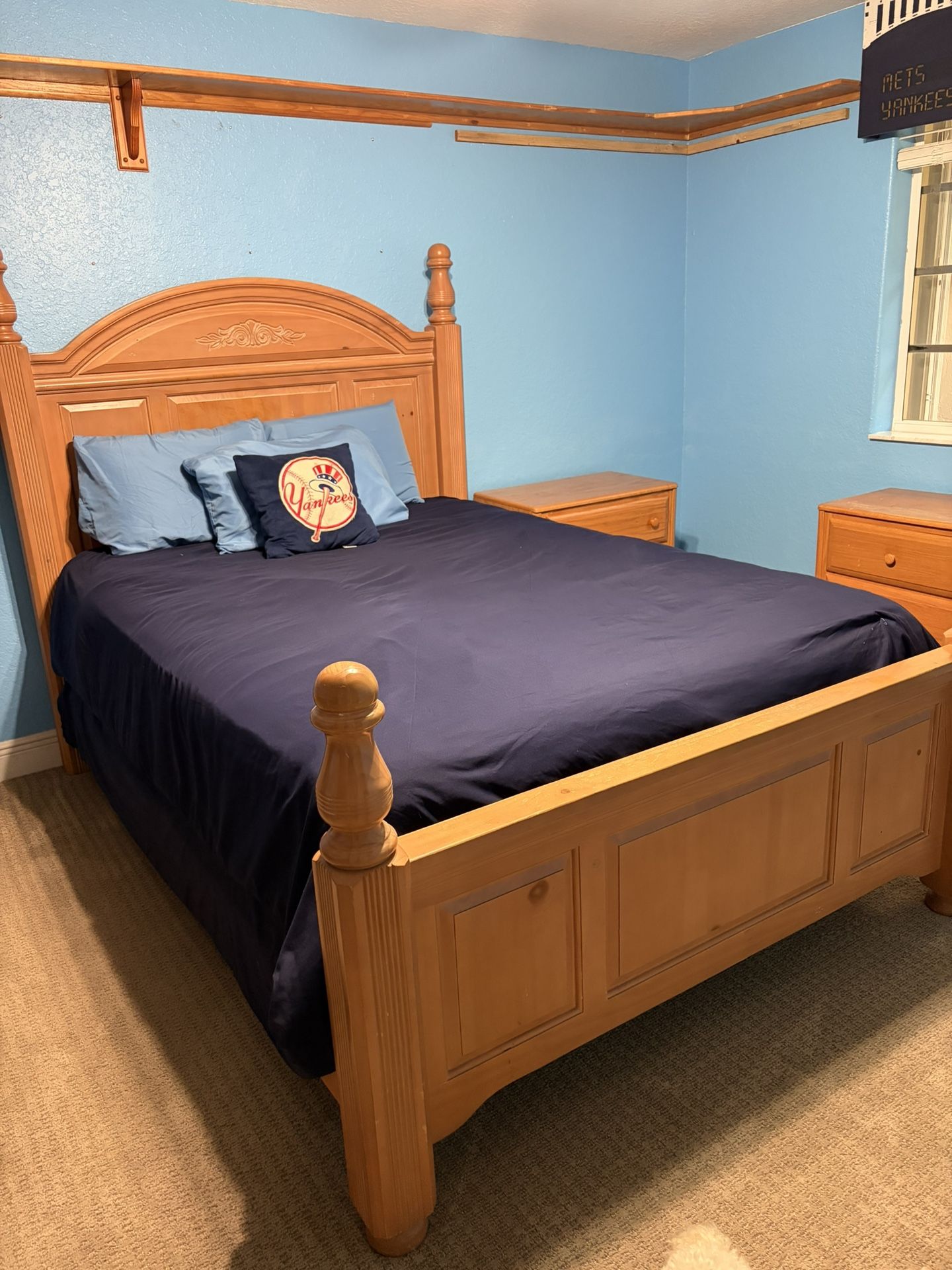 Queen size Head and Foot board Double dresser 4’ wide x 27 1/2 high, 17” deep Desk 47 1/2 wide 28 1/2 high 22 deep Chair Night stand 29 1/2 wide 28 1/2 high 17 D No corner piece
