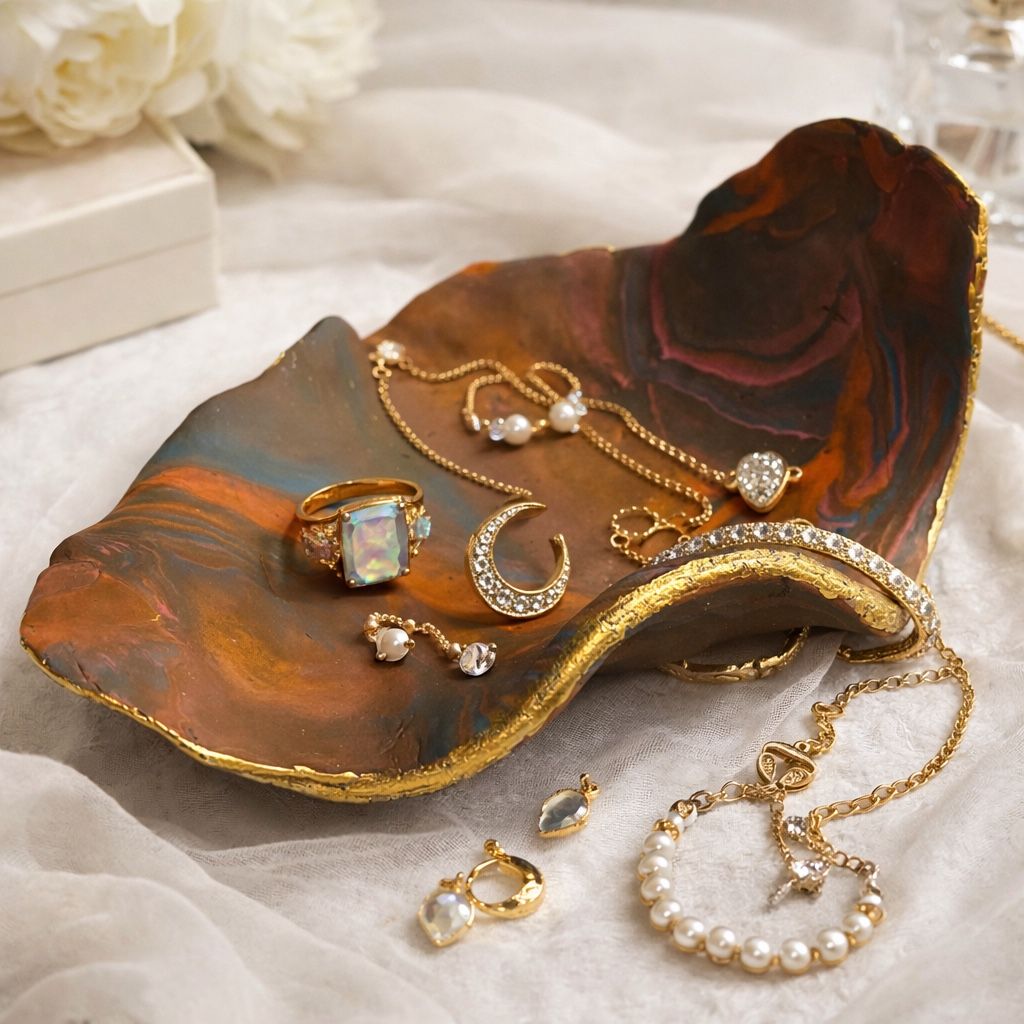 This handmade polymer clay jewelry dish is a functional work of art. Crafted with flowing abstract patterns in rich, earthy tones and finished with a hand-applied gold-edged detail, each tray is truly one of a kind. Perfect for organizing rings, earrings, necklaces, bracelets, or small keepsakes, this lightweight yet durable polymer clay dish looks beautiful on vanities, nightstands, dressers, or coffee tables. ✨ Details: • Made from high-quality polymer clay • Handcrafted abstract design • Gold-edged finish for an elegant touch • Lightweight yet sturdy • Ideal for jewelry, trinkets, or small decor items • Each piece is unique — no two are exactly alike This dish makes a thoughtful gift for birthdays, weddings, anniversaries, housewarmings, or anyone who loves stylish organization and handmade decor. 💛 A beautiful resting place for the pieces you love most.