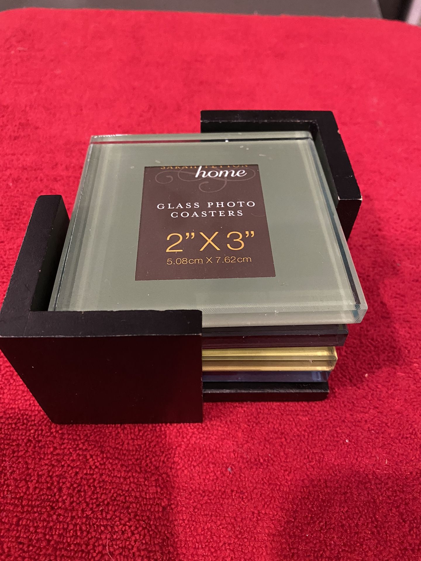 4 glass table photo coasters with black wood coaster holder. You can add a 2x3 picture. Never use just been storage.