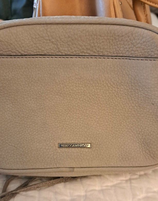Gray pebbled leather Rebecca Minkoff leather crossbody bag. Detachable adjustable length strap with chain. Outer purse has one snap pouch, and one open pouch on other side . Silver tone hardware. In very good condition. Comes with dust bag.
