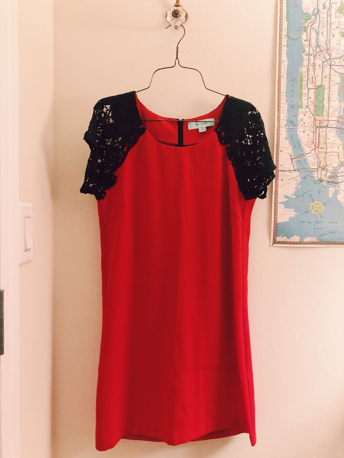 Camilla Tree red cocktail dress with black lace cap sleeves (size small/petite)