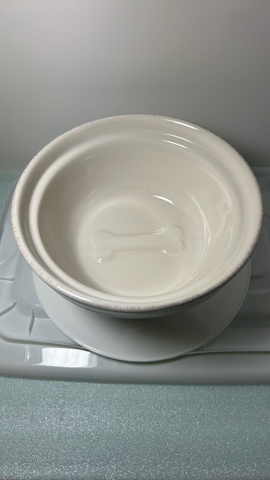 Large and heavy Pottery Barn dish with raised dog bone in bottom of dish. It is 7-1/4” across on top and 5 “ on bottom. It is 3 “ deep. It has some dis coloring around the top edge . Texas City area pickup is available.
