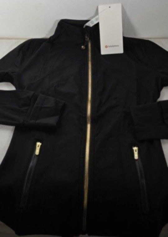 Black Lululemon Jacket Gold Zipper - Size 2. This is a New Black Lululemon Jacket designed with a flattering, slim fit. It features a shiny gold front zipper that adds a touch of elegance and contrast. The jacket is a Women’s Size 2, ideal for a petite or fitted look. Made from Lululemon’s signature stretchy, breathable fabric, it offers comfort and flexibility for active or everyday wear. Subtle logo detailing and functional pockets complete its stylish, high-performance design. New with Tags and Lululemon Bag.