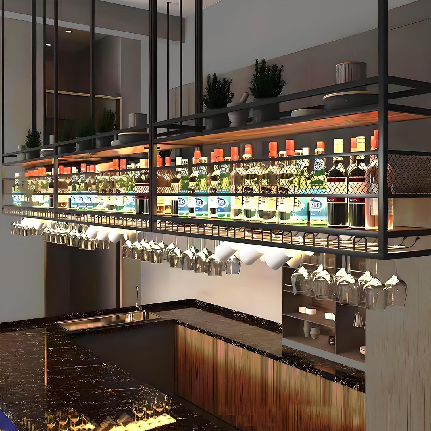 New | 47.2" Ceiling Hanging Wine Glass Rack with 2-Tier Wooden Shelves & Glass Holder