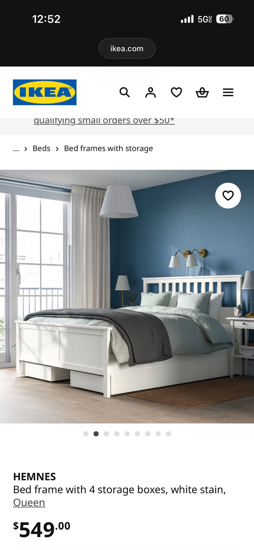 IKEA Hemnes Queen size bed with mattress and box spring included! Additionally it includes 4 storage boxes underneath the bed. This is a well cared for bed selling for only $100 ( originally $485)! Please contact me (call/ text/message) as soon as possible because I need to be out of my apartment by 12/25/25, thank you🙏. Sincerely, Raquel (contact info removed) Measurements Length: 83 7/8 " Width: 65 3/4 " Footboard height: 26 " Headboard height: 47 1/4 " Mattress length: 79 1/2 " Mattress width: 59 7/8 " Height of drawer (inside): 7 1/8 " Height: 47 1/4 " Drawer depth (inside): 25 1/4 "