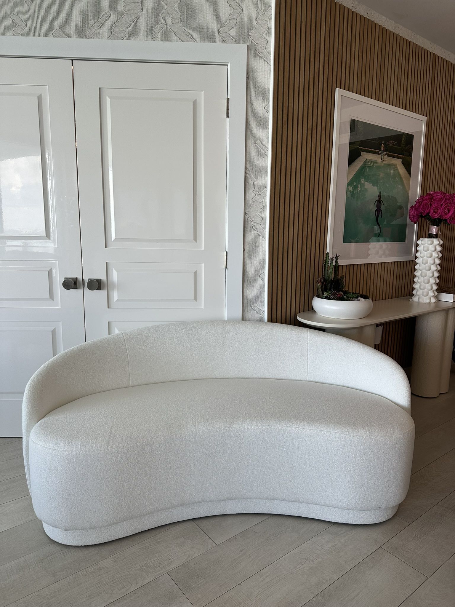Give your living room seating a contemporary look with this curved boucle loveseat. This loveseat sofa features a distinctive curved design for modern style. Upholstered in cream boucle-textured fabric, it looks great with a wide array of decor styles. Dimensions (Overall): 29.5 Inches (H) x 67.3 Inches (W) x 29.5 Inches (D) Seat Dimensions: 62.6 Inches [W], 21.3 Inches [D], & 18.9 Inches [floor to seat top] Seat Back Dimensions: 11.4 Inches (H) x 67.3 Inches (W) Weight: 60 Pounds
