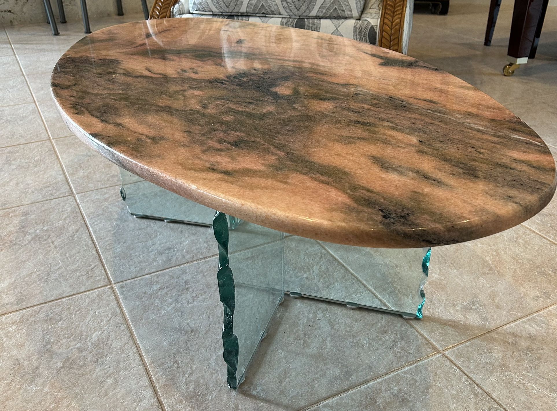 Beautiful Pink & gray granite on glass legs 48”x 26” PLUS 3 matching slabs: two 28” squares and one oblong entrance table with a straight side to fit against the wall, 5’ long x 18” wide.