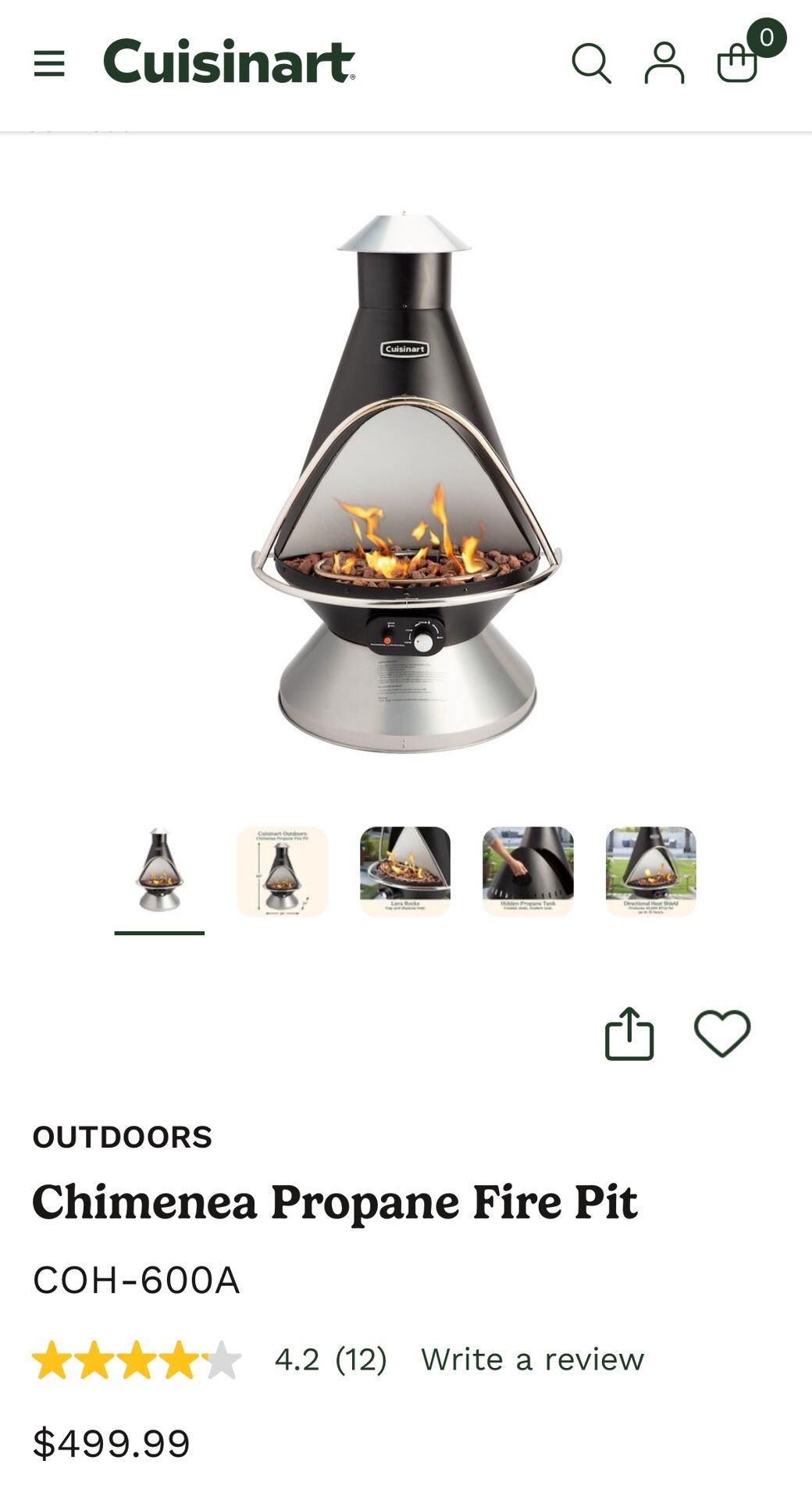 Brand new, never used — still in the box Cuisinart Chimenea Propane Fire Pit (Model COH-600A) — perfect for your patio, backyard, or outdoor space. • 40,000 BTUs with adjustable heat — will keep you cozy. • Runs 9-15 hours on a standard 20 lb propane tank (tank not included). • Includes 8 lbs of lava rocks for better heat distribution and ambience. • Durable steel frame with a weather-resistant finish. • Dim: approx. 31″ L × 31″ W × 48″ H; weighs about 56.5 lbs.