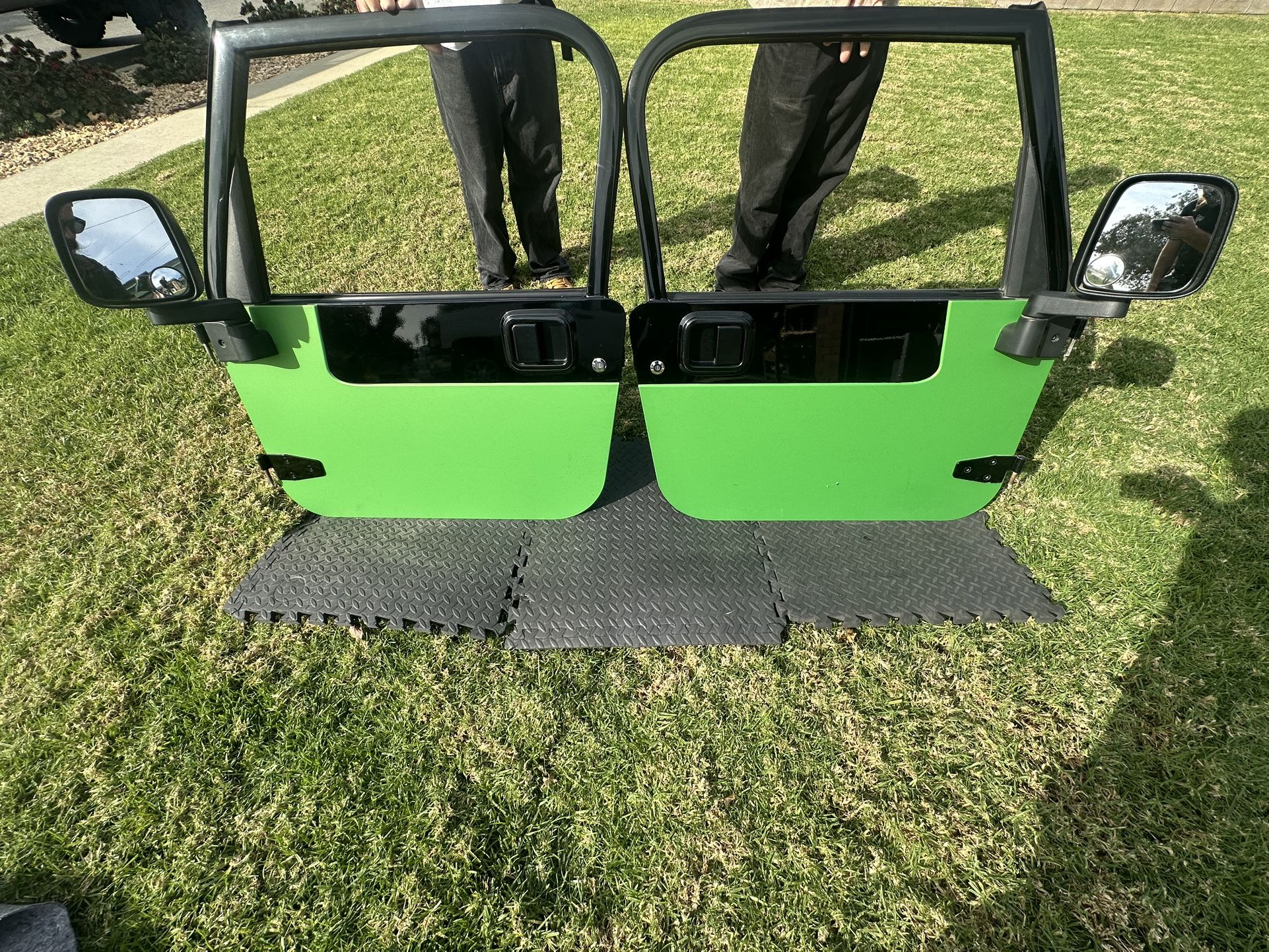 Black full doors with glass off a 2006 Jeep LJ which are directly compatible with all wranglers from 1(contact info removed) ( currently wrapped in Kawasaki green but can easily remove ) Sand Jack All Aluminum storage drawer chest for Jeep LJ Full soft top for Jeep LJ Spider Top mesh awning Mud flaps
