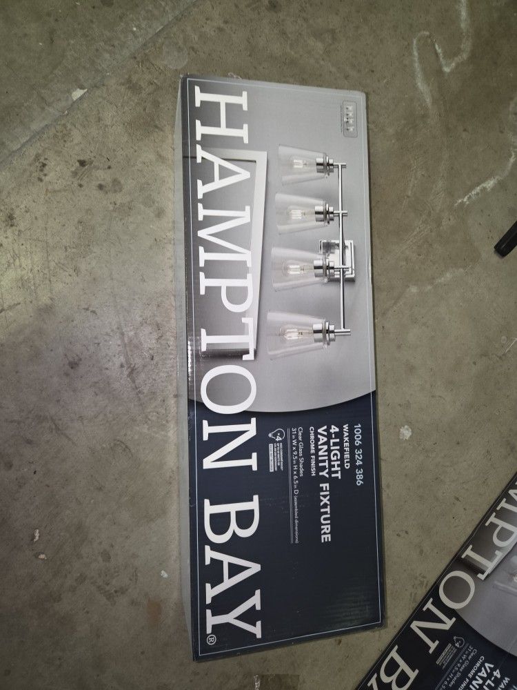 4 - Hampton Bay Champlain 31.5 in. 4-Light Brushed Nickel Modern Bathroom Vanity Light with Clear Glass Shades $75 each retail $109 1-Wakefield 31 in. 4-Light Chrome Modern Vanity with Clear Glass Shades $75. Retail $119 1-HAMPTON BAY MARSDEN 5-PIECE BATH SET BRUSHED NICKEL FINISH $75 retail $99 2- 4 pack solar pathway lights Hamilton Bay. $50 each. Retail $79 Tiki torches $3 each