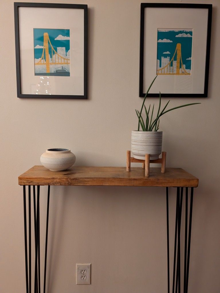 This extra-tall, bar-height console table is handcrafted from solid wood and paired with sleek metal hairpin legs for a modern, industrial look. Its narrow profile makes it ideal for tight spaces while still making a bold statement. Perfect for an entryway, behind a sofa, along a hallway, or as a standing-height accent table. Built by hand and made to last. Dimensions:, 32” long, 9.5” deep, 41.5” tall.