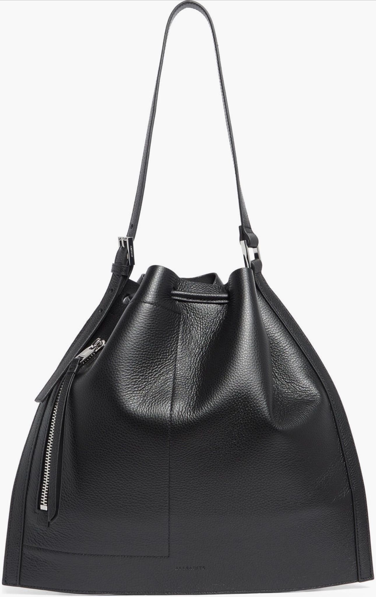New 10" strap drop Drawstring top closure Adjustable shoulder straps; single top handle Front zip pocket Leather Imported