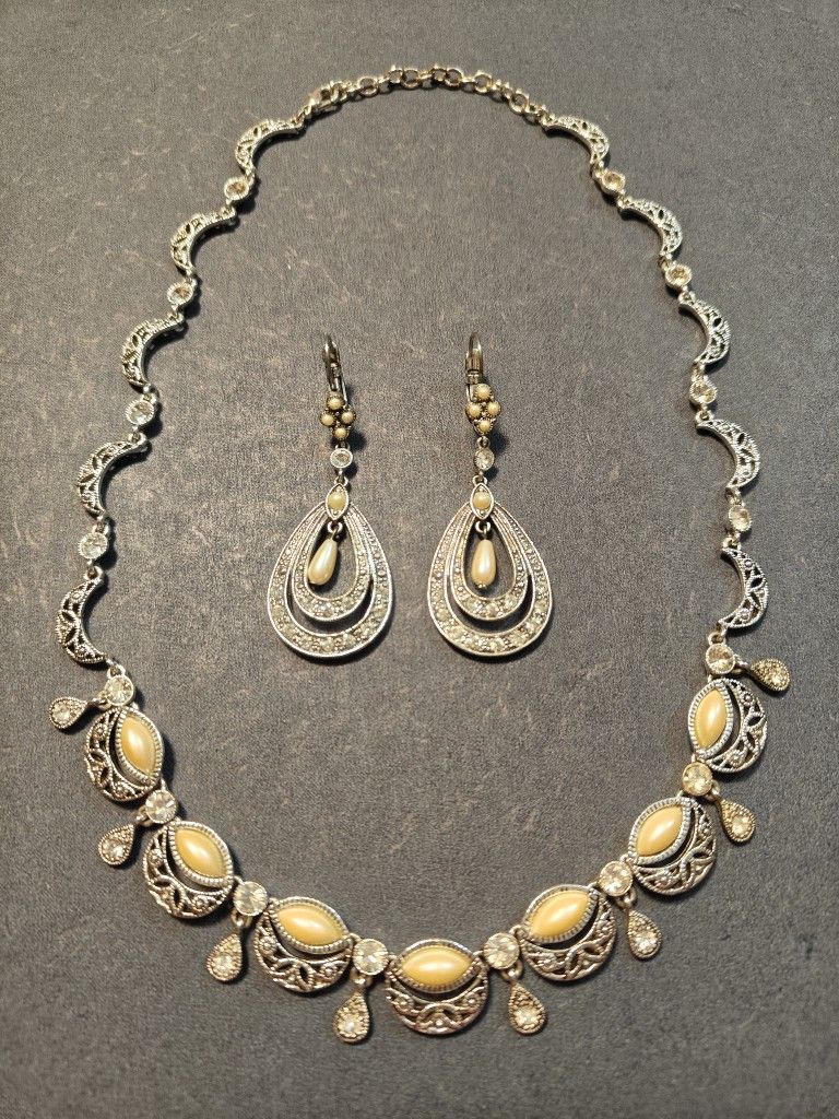 Vintage necklace and earrings set, silver tone with faux pearls and clear rhinestones, scalloped design with oval faux pearls surrounded by rhinestones, and the earrings are teardrop shaped with a faux pearl in the center and rhinestones around the edges. Reproduction of the Edwardian or Art Deco era. Has delicate filigree work. Makes a beautiful bridal set. This set was purchased in Macy's about 25 years ago and has been lovingly preserved. In perfect, new condition.