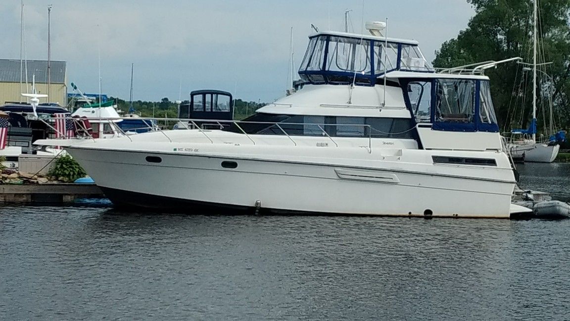 1990 Silverton 41 ft. Aft Cabin for sale. Kept very clean. Has 2 bedroom with queen sized beds, 2 bath with separate showers, salon with 50 inch flat screen TV and pull out sofa bed. The galley has a fold down dining table/bed option. The kitchen has a 2 burner stove, full size refrigerator, convection oven and an Ice maker. The patio is nice and large and comes with furniture. Full canvas included and updated interior colors. It has all safety equipment. and meets all safety requirements. It has two 502 Crusader engines and runs great! This is one of a kind. Don't miss it! It is currently in a slip in Oconto, WI, on the Oconto River. Contact Ron at (contact info removed). $69000 OBO.