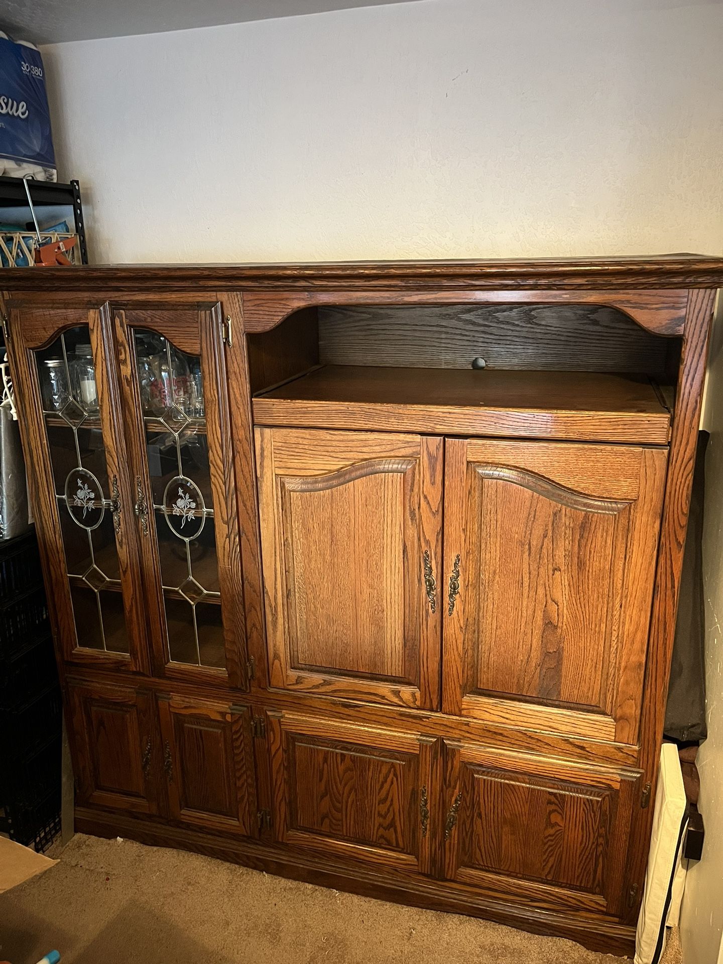 Solid wood entertainment center Dimensions: 63-1/4” long 62” high 22” width TV pocket 32” 26-1/2” Needs to be picked up