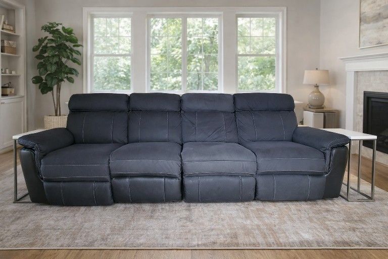 Modern 4-seat sofa upholstered in soft, premium microfiber with a leather-look finish. Extremely comfortable, supportive, and perfect for a living room, family room, or media space. Seating & Recline Details: •4 total seats •3 reclining seats •1 of center seats does not recline •Two manual recliners •One power recliner (right end when facing the couch) •Smooth reclining action, plush cushions, and wide armrests for maximum comfort. Dimensions It's ~110" long, 38" high, 40" deep Included: •Matching 2 modern end tables (included with the set for free) Condition: Gently used, excellent considering Clean, smoke-free home Small rip on the top back corner (cosmetic only, and barely even noticeable) Otherwise in solid, well-maintained condition This is a high-quality, comfortable sofa set that looks great and is ready for a new home.