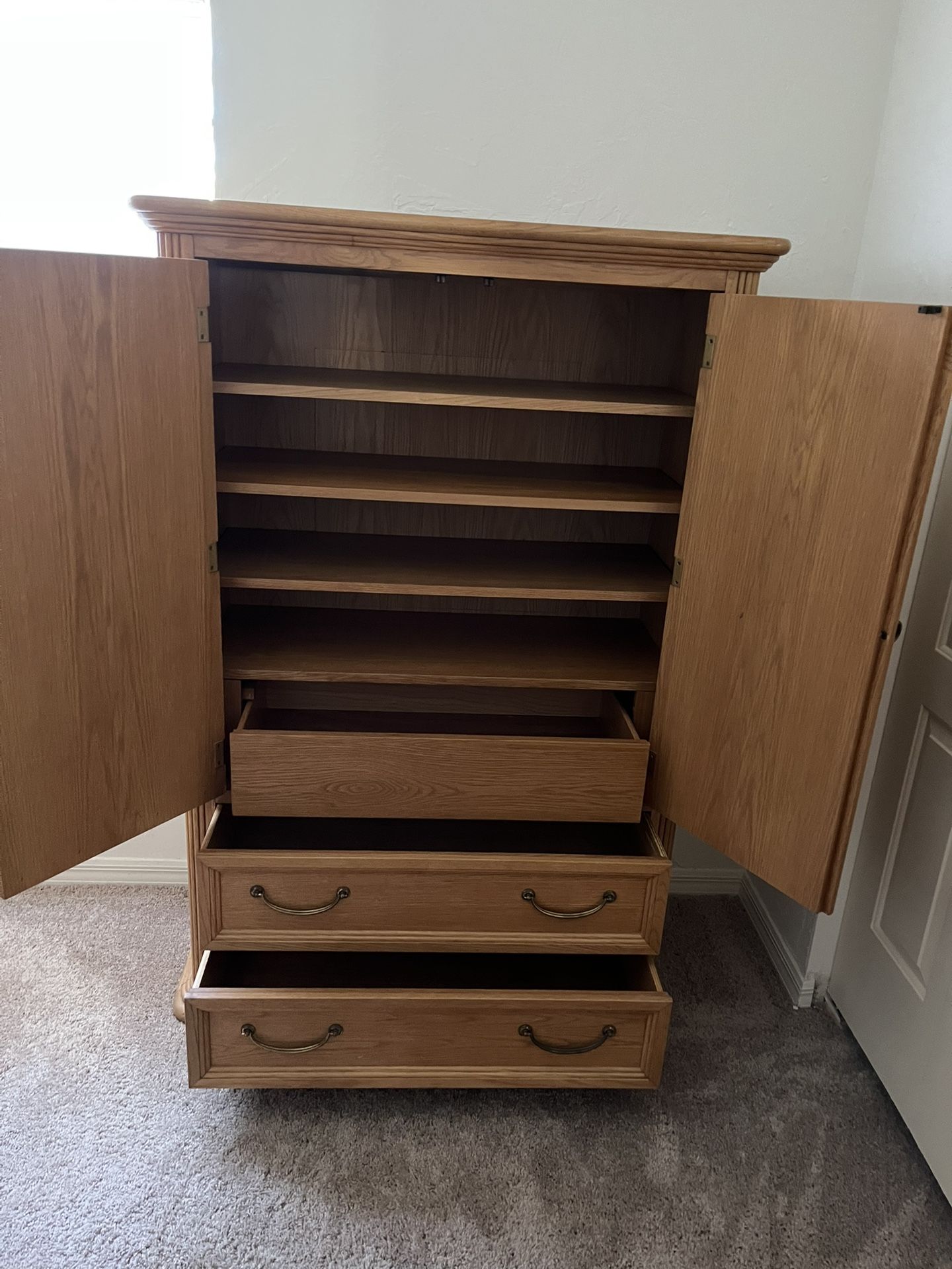 3 Pieces! Stylish & Classic 4 shelf, 3 drawer Solid Wood Armoire, Matching Headboard and Unfinished Comforter Chest Beautiful and in excellent Condition!