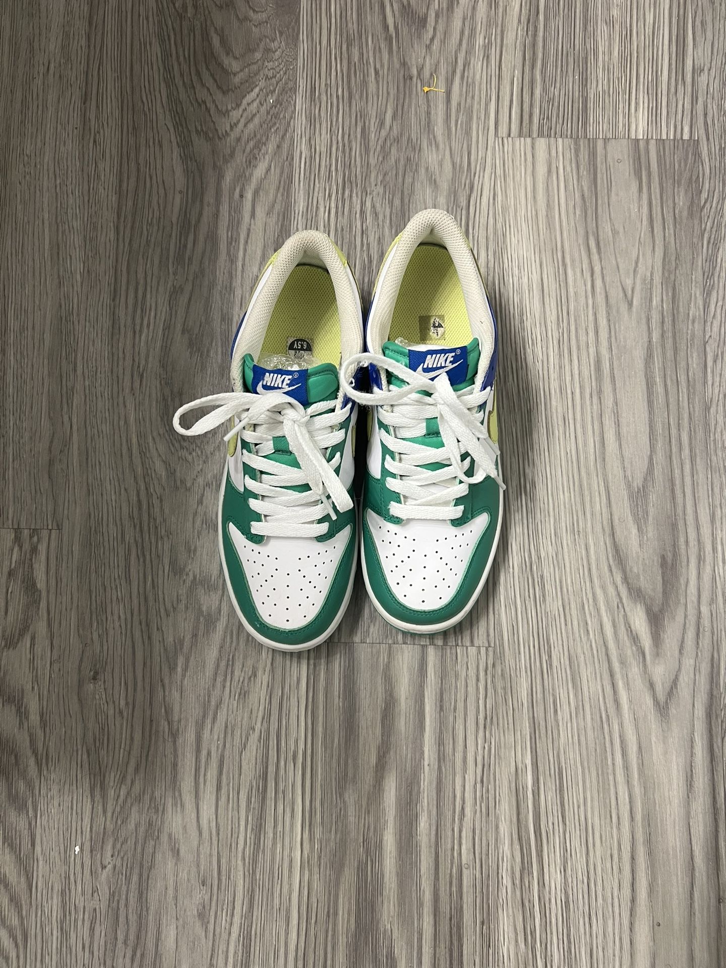 a classic white leather base with vibrant green overlays on the toe, eyestay, and outsole, contrasted by royal blue on the heel overlay, with "Lemon Twist" pale yellow hitting the Swoosh and heel tab for a bright pop, all built on a traditional white midsole and durable rubber outsole for a fresh, color-blocked look with retro flair. Size 6.5 no box