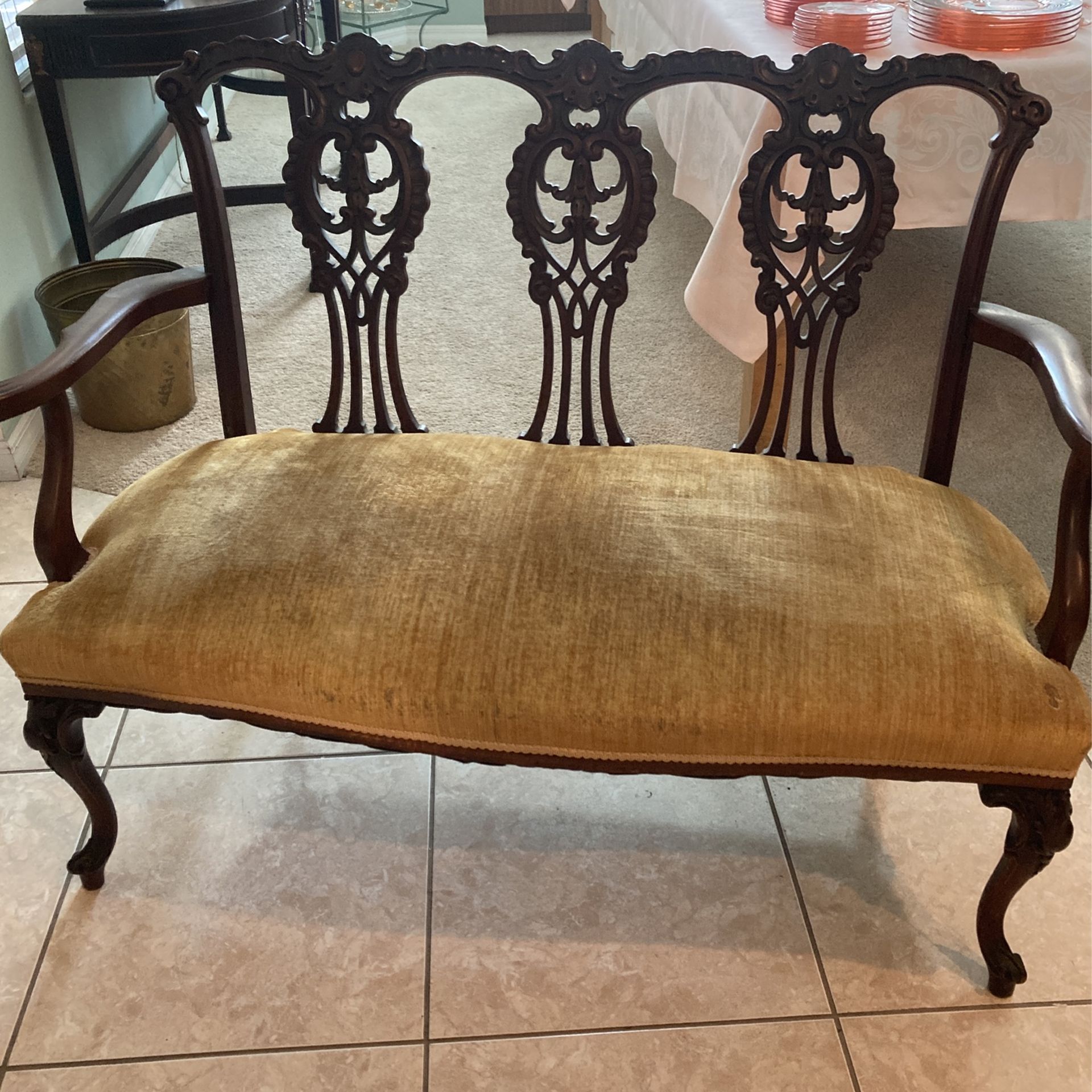 Circa 1900’s Upholstered Love Seat/settee---with Heavily Carved Mahogany Back.