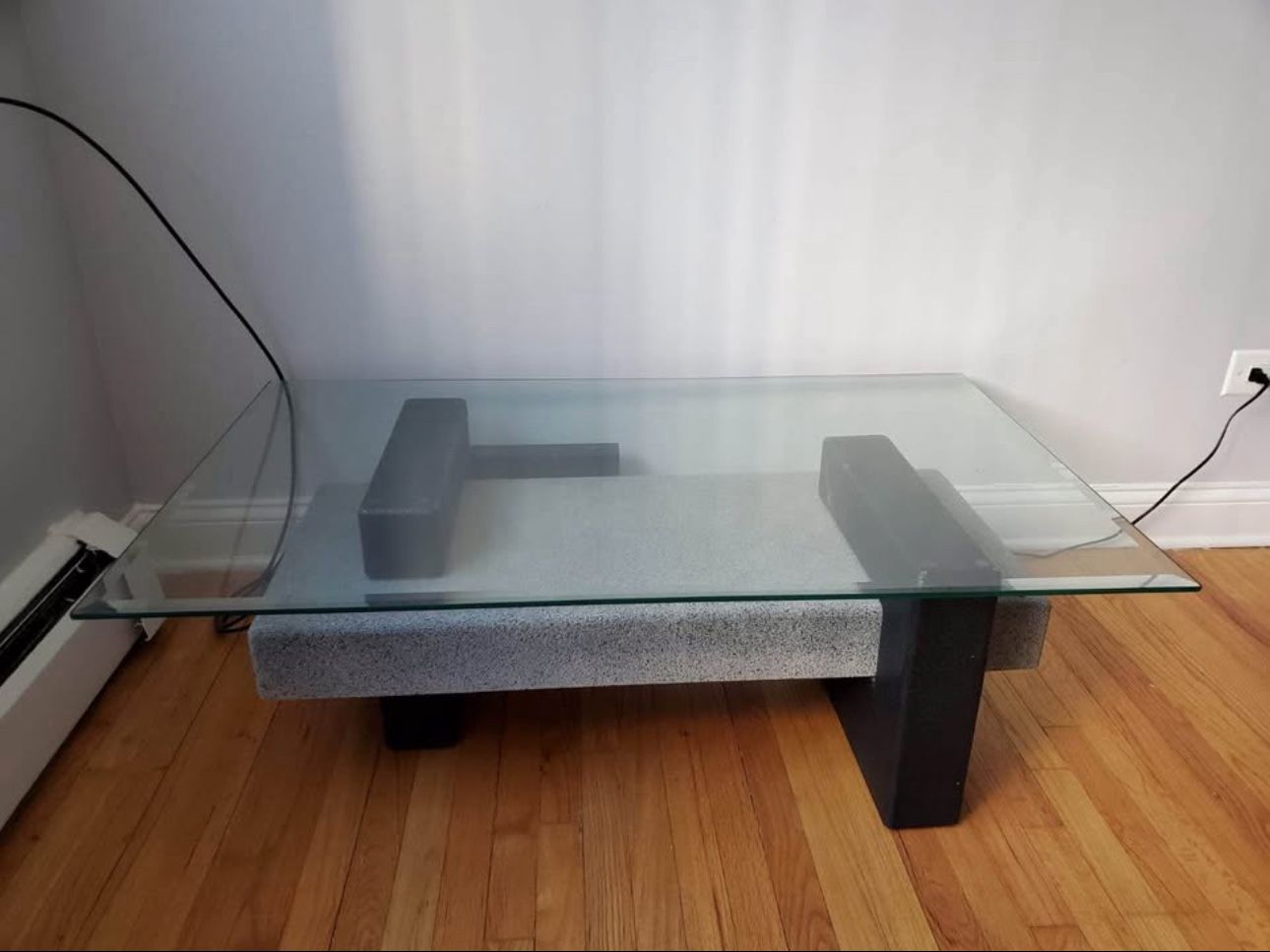 Solid wood with a faux concrete finish and topped with thick tempered glass. Includes: 1 Console Table (perfect for entryway or hallway) 1 Coffee Table 1 Side Table / End Table