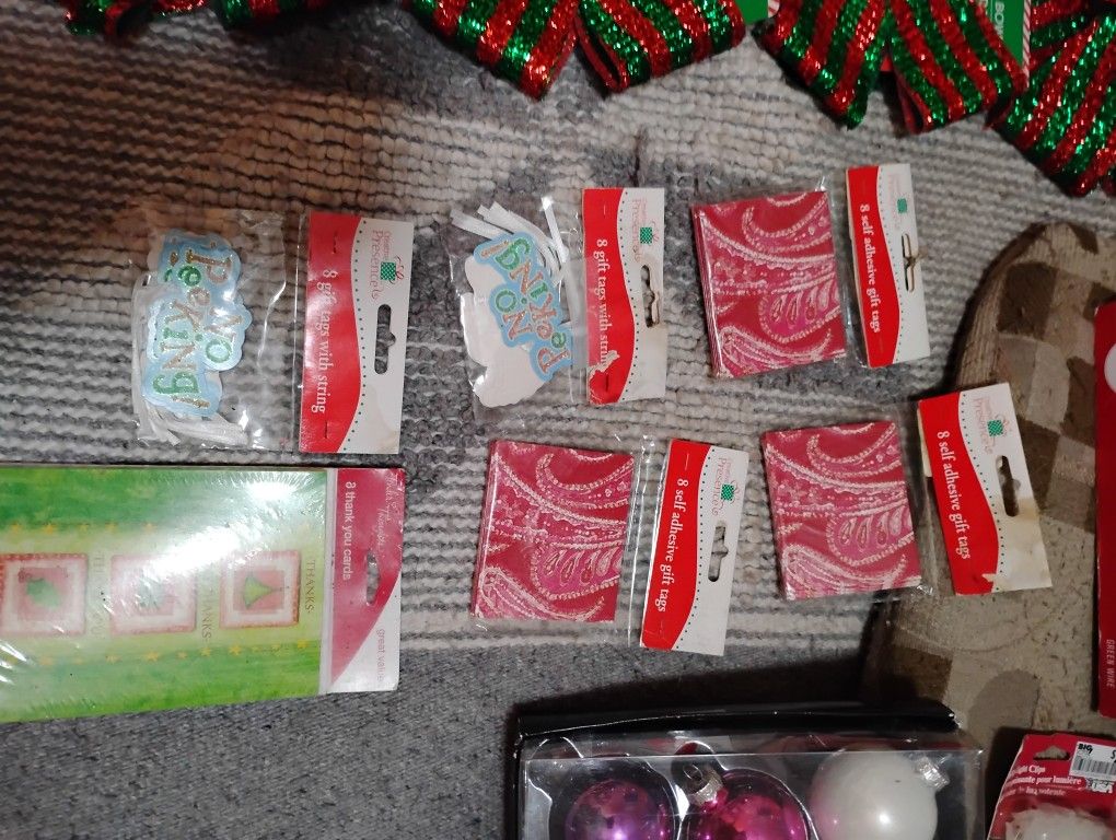 Christmas decorations,two tree toppers one gold,one silver, one strand of ribbon style white lights,two rolls of ribbon, four ready made new bows, gift tags, thank you cards,light hooks and suction cups,and ornaments., will take thirty five dollars for all of it.