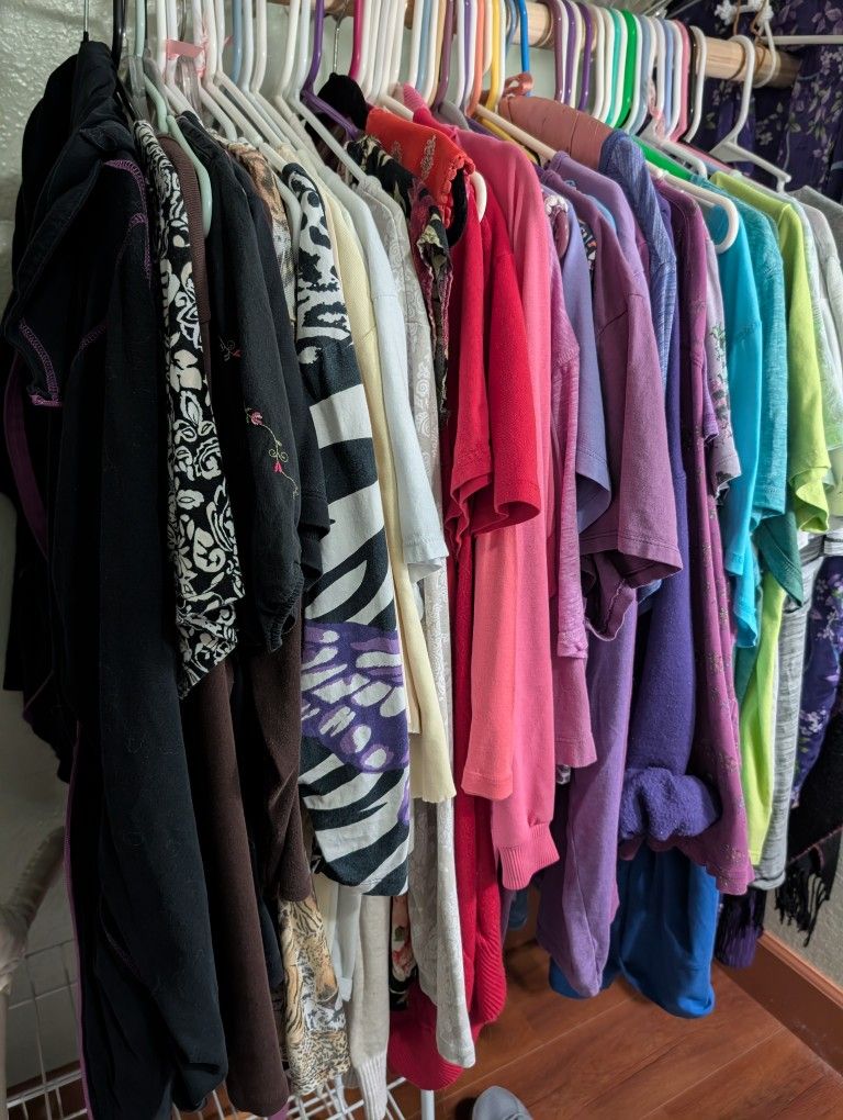 An entire wardrobe, as much or as few as you'd like. Some brand new, some well loved. Mostly pinks, purples, reds, and mostly easy care knits. Tons of blouses, camis, a few cardigans. Around a dozen stretch pants, sized for a short lady. Also a few shorts, camis. Make offer please. The whole thing for $50? Open to trades as well.