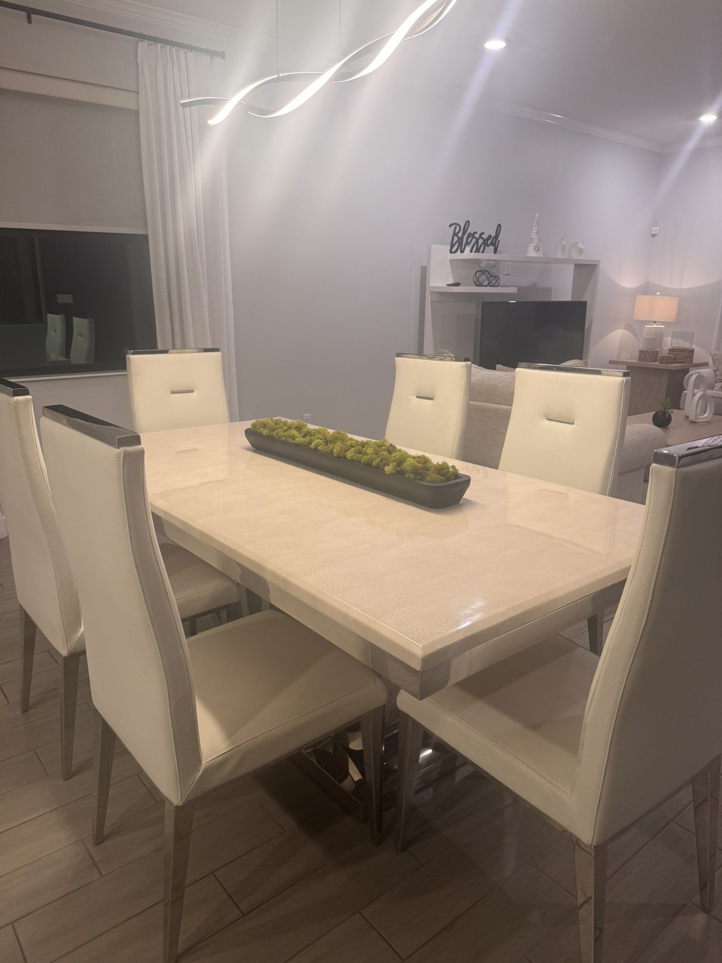 Dining table and chair originally bought from el Dorado store in 3,200 Store, Color white with metal and 6 leather chairs.