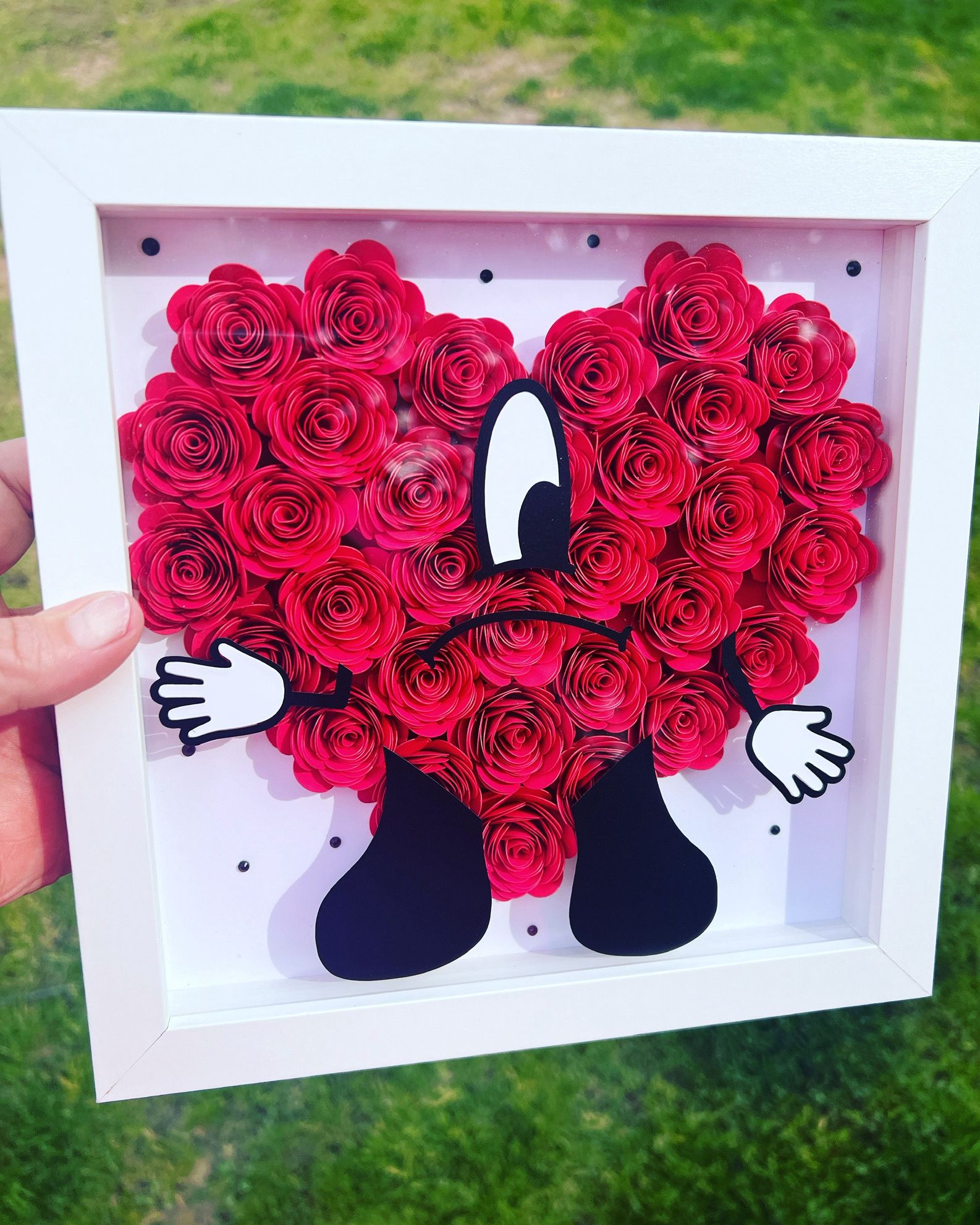 This is an 8x8 shadow box with rolled paper flowers. Can be done in a white or black frame, your choice. Great gift idea for any Bad Bunny fan ❤️ Local pu in Riverside near La Sierra and Arlington.