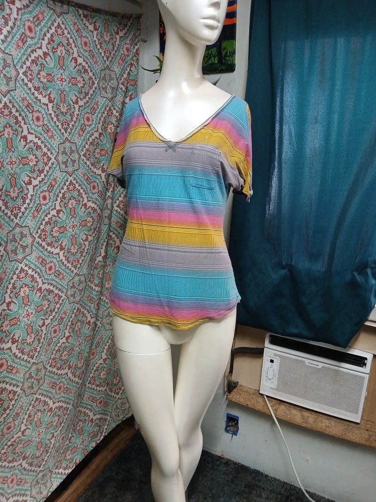 Preowned, fair condition. Freshly washed. 2 small holes near center bottom of waist. Cold shoulder style top with adjustable tie sleeves. Single front chest pocket on left side. Rainbow tie dye stripes. 100% cotton. Majority of stitching is in surprisingly great condition for its age. Machine wash cold, gentle cycle, with like colors. Non-chlorine bleach. Tumble dry low. Remove promptly. Low iron. Delivery or pickup. This item is cross listed on other sites, so first come, first serve. Approximate measurements with the item laying flat are as follows: Waist - 16" Pit to pit - 18" Length (collar to bottom) - 16" Pocket depth - 3¼"