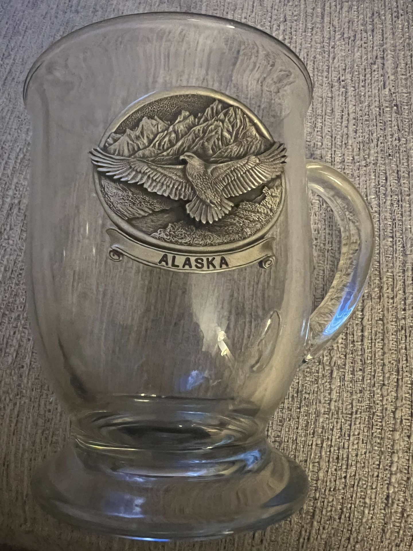 This is a heavy glass beer stein mug featuring a pewter emblem of an eagle and Bear with the word "ALASKA". Description: The mug features a detailed, three-dimensional sculptural emblem of a grizzly bear in a wooded scene, cast in solid pewter and affixed to the glass. The word "ALASKA" is visible at the bottom of the emblem. Material: Glass mug with a pewter emblem. Capacity: Similar items from manufacturers like Heritage Pewter are commonly available in various sizes, such as 15 oz, 16 oz, or 25 oz (super stein) capacities. Availability: These types of mugs are available for purchase new from retailers like Heritage Pewter . Care Instructions: Pewter-embellished glass mugs are often recommended for hand wash only. Shopping Information These mugs typically range in price depending on condition (new vs. used) and retailer, generally falling between approximately $30 and $45 USD. Local pickup in Denver area and cash only. $35 /each. Buy both for $60