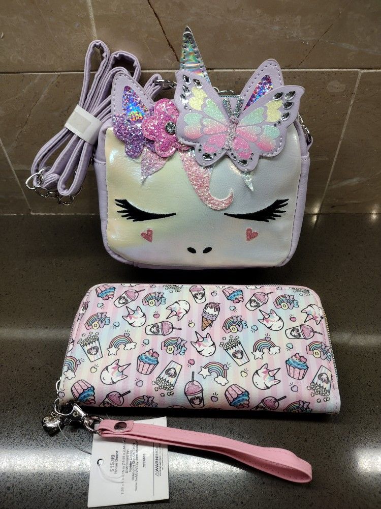 This is a collection of NEW Unicorn Crossbody Bags and Wallets. These will definitely complete her look for the day and is the perfect companion for a day out with the family. With a fun design and adorable detailing, and a rainbow zipper that's so cool! * NEW Crossbody Unicorn Purse with multiple layered accents featuring a butterfly, horn and flowers. It measures 7" wide x 6" tall x 2.5" thick. $13 * NEW Unicorn Wallet will help keep your essentials organized. It features unicorns, ice cream, cupcakes, popcorn, and more, all against a striped rainbow-colored background. Unzip the zipper to reveal the interior with its divided pouches and slits for cards and cash! Toss it in your purse and take it on the go. It measures 4" tall x 8" wide x 1.18" thick. - $8 They are all in NEW condition with tags and located on the west side. Please click on my name to see other items I've posted
