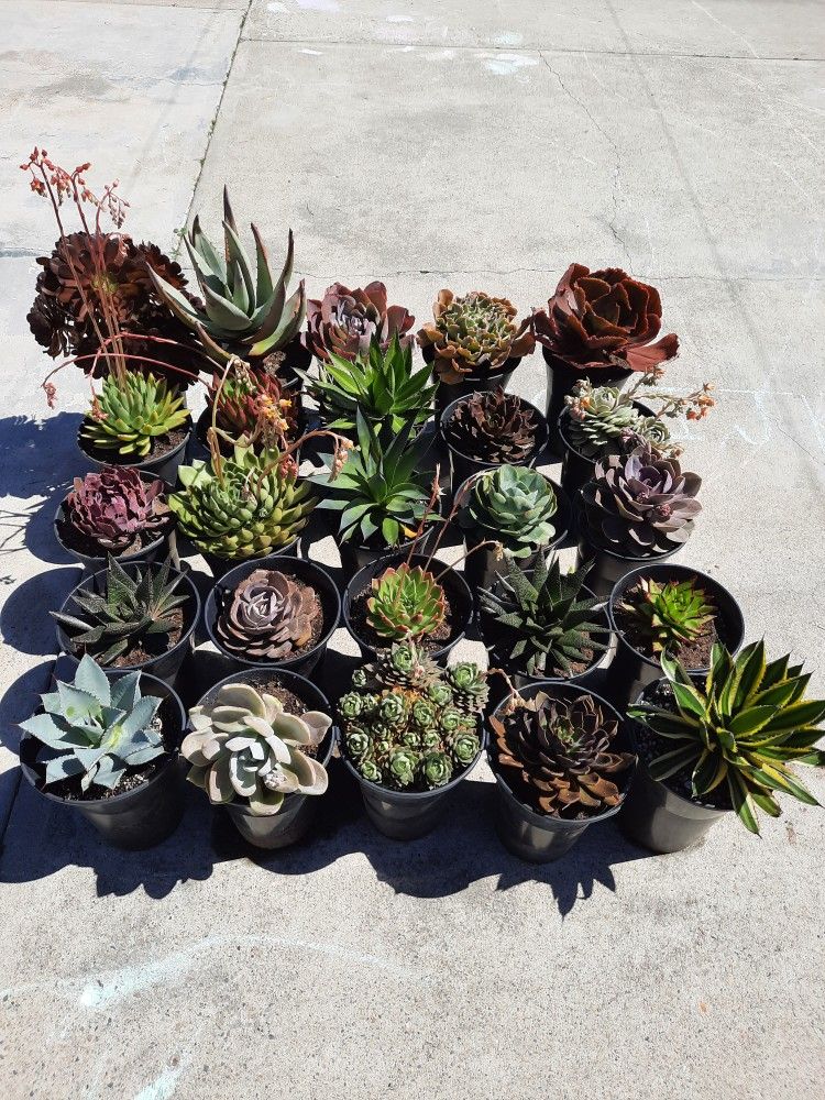 25 different types of succulents in about 2 gallon pots, $15 and up depending on plant.