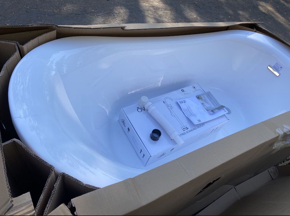 Located in Foresthill, CA Bath is new, no box, has crack on the left side from drain (does not affect the bathtub function) shown in photos. Features: Tub Dimensions: 70"L x 34.3"W x 30"H Freestanding Faucet Faucet Has Chrome Finish With Brass Construction