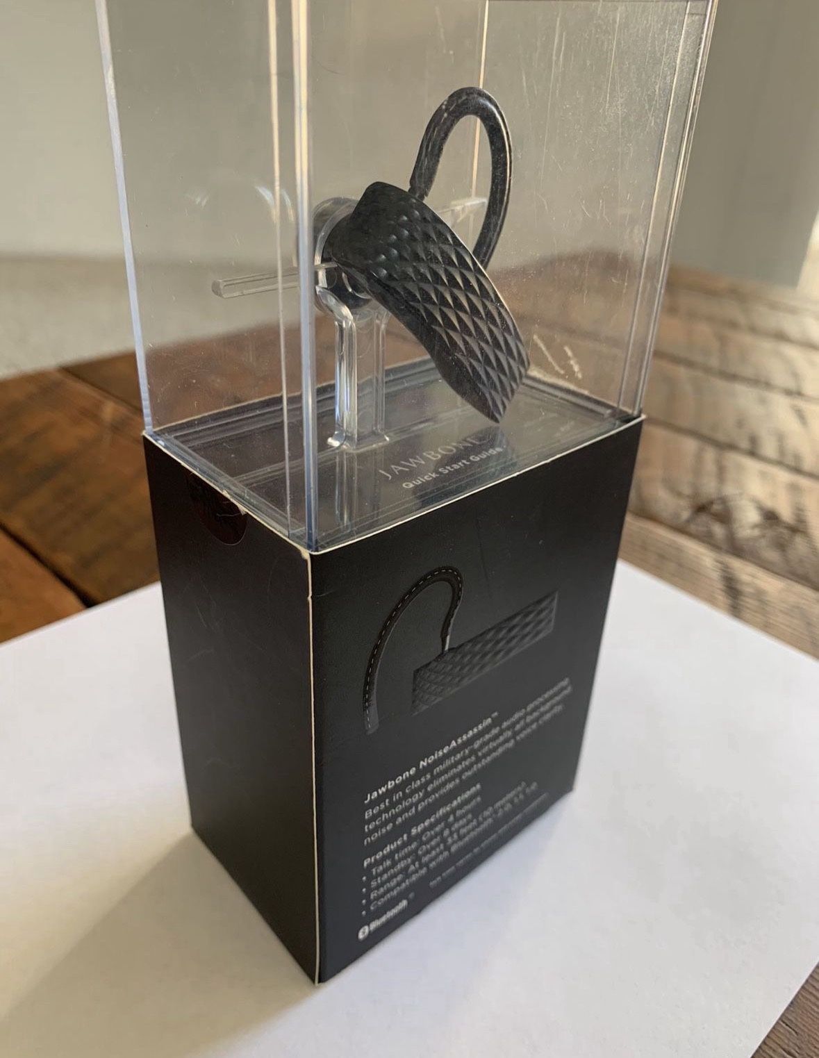 Jawbone Noise Assassin bluetooth noise canceling headset, wind reducing headset phone answer, voice activity sensor. Includes extra earlobe, large and small earbuds for size customization, USB Charge Cable, Travel USB Charger, user manual, original packaging. In good condition,