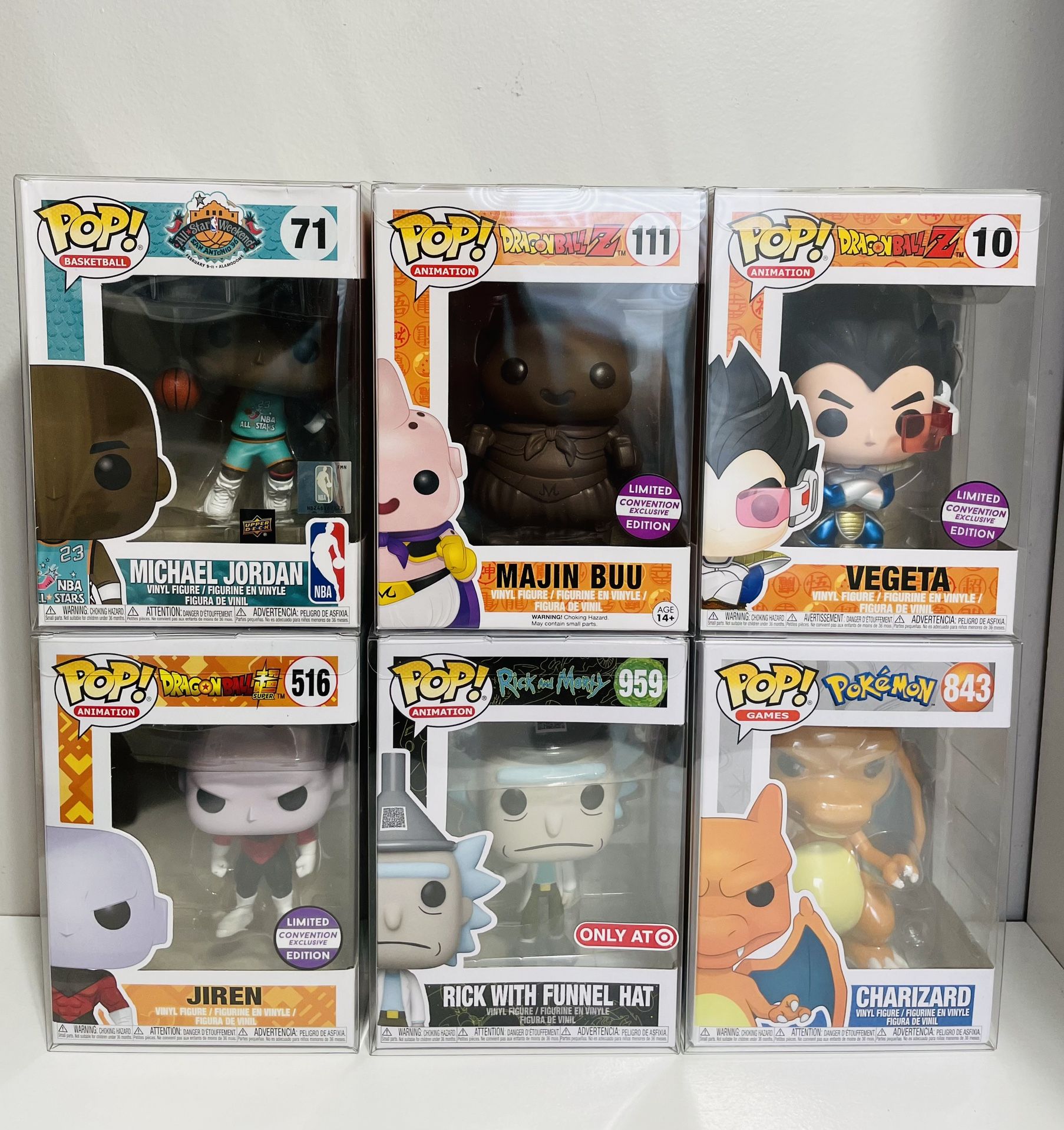Funko Pops!!! Read! They are Brand-New and sleeved since purchased! BrandNew never opened!! Selling individually!!! Prices are Firm Unless buying multiple, Thank You. Pokémon Charizard Pop 843 - $55 One Piece Luffytaro Pop 921 - $45 Michael Jordan Pop 71 - $30 Rick and Morty Pop 959 - $30 Dragonball Z Vegeta Limited Pop 10 - $80 Dragonball Z Majin Buu Limited Pop SOLD Dragonball Z Jiren Limited Pop 516 - $45