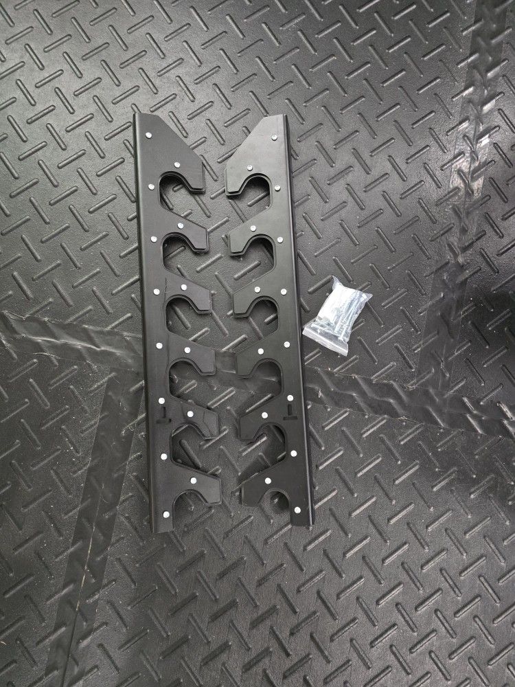 Titan Fitness wall mounted barbell gunrack for 6 bars. Includes UHMW protection for your bars. Also includes two different screw types, including some I purchased separately to make smaller holes in the wall.