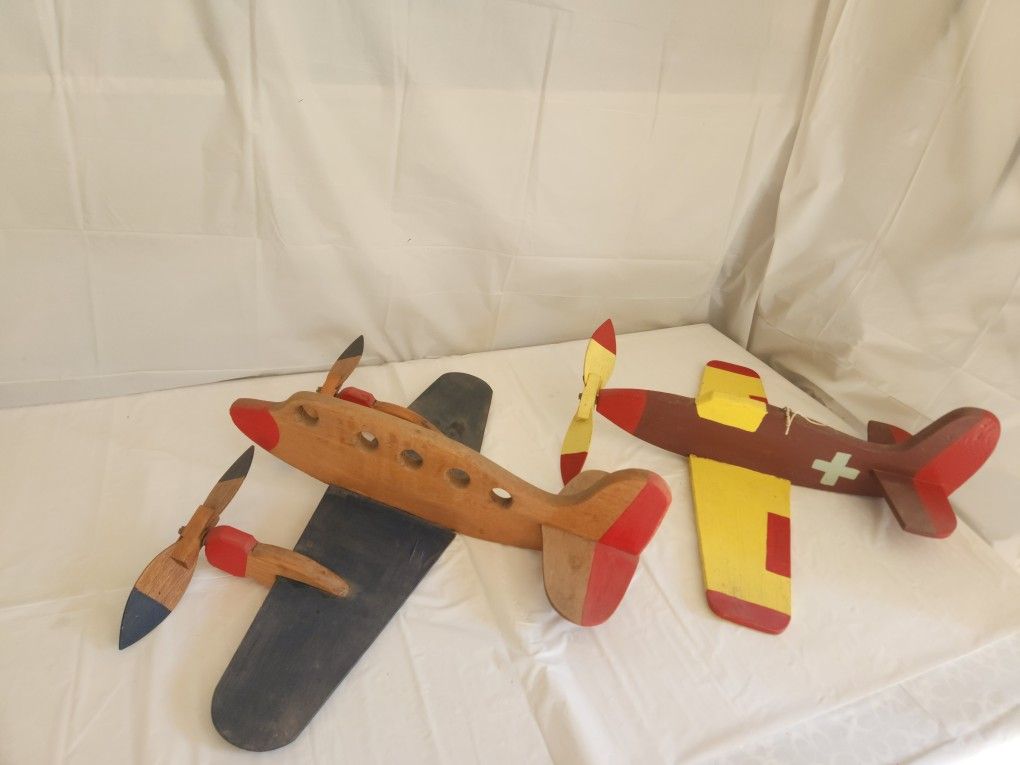 Large, handmade wooden model airplane measuring approximately 20 inches long. Features hand-painted details in red, yellow, and natural wood tones. The propeller spins and the design has a classic vintage/folk art feel. $40 for ALL I can meet in Clovis, Fresno, Madera, Coarsegold, and Oakhurst Depending on the day and time.