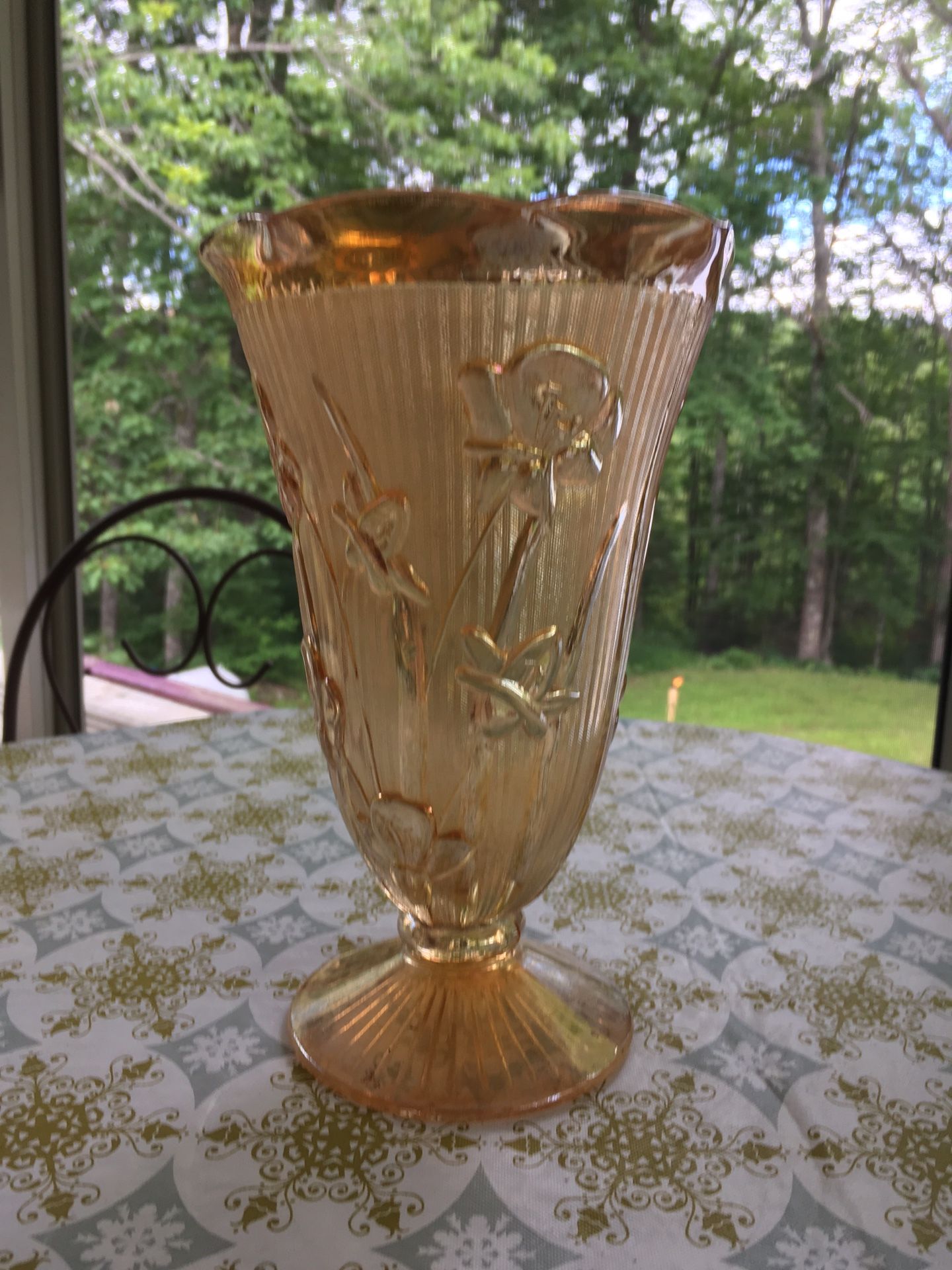Marigold colored depression glass "Iris" by Jeannette vase . It stands 8" high and is 5-1/2" around. No cracks or chips. Asking $25 OBO