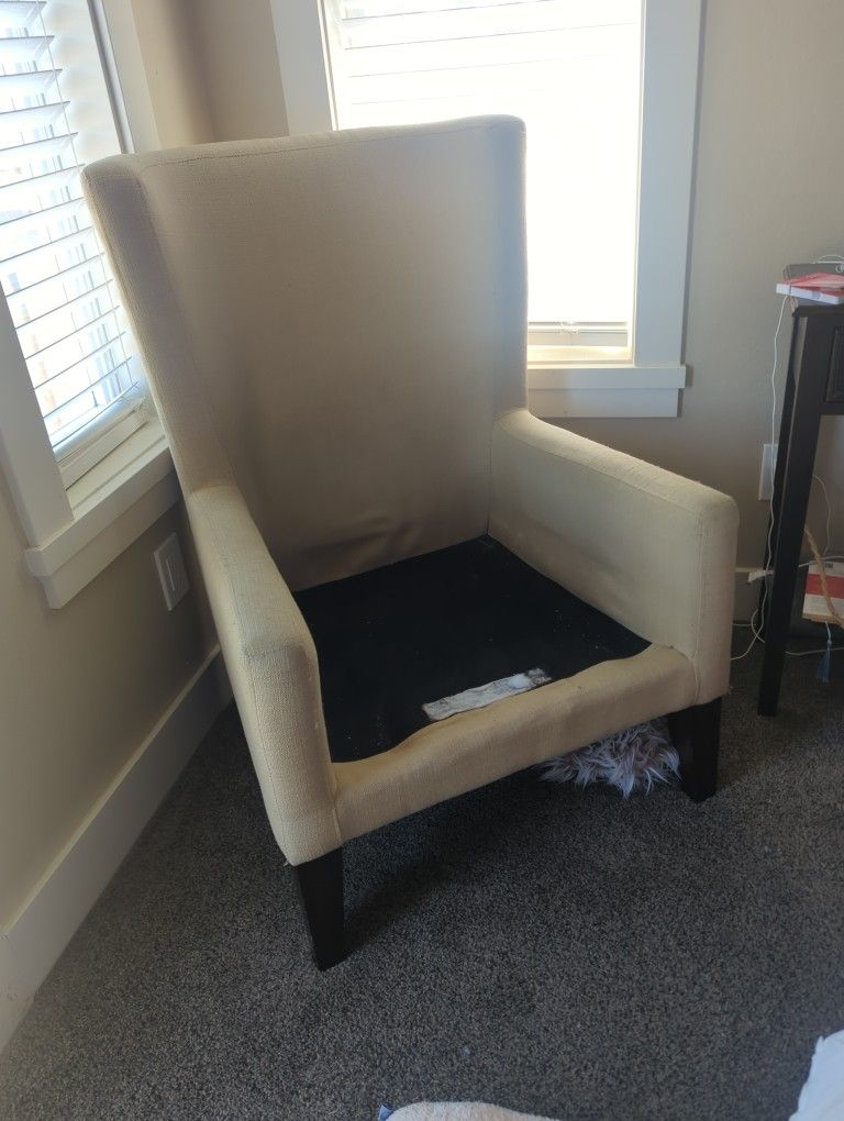 This chair is sturdy, but missing the seat cushion. It's ready for you to take home and refurbish and give it a new life! Free