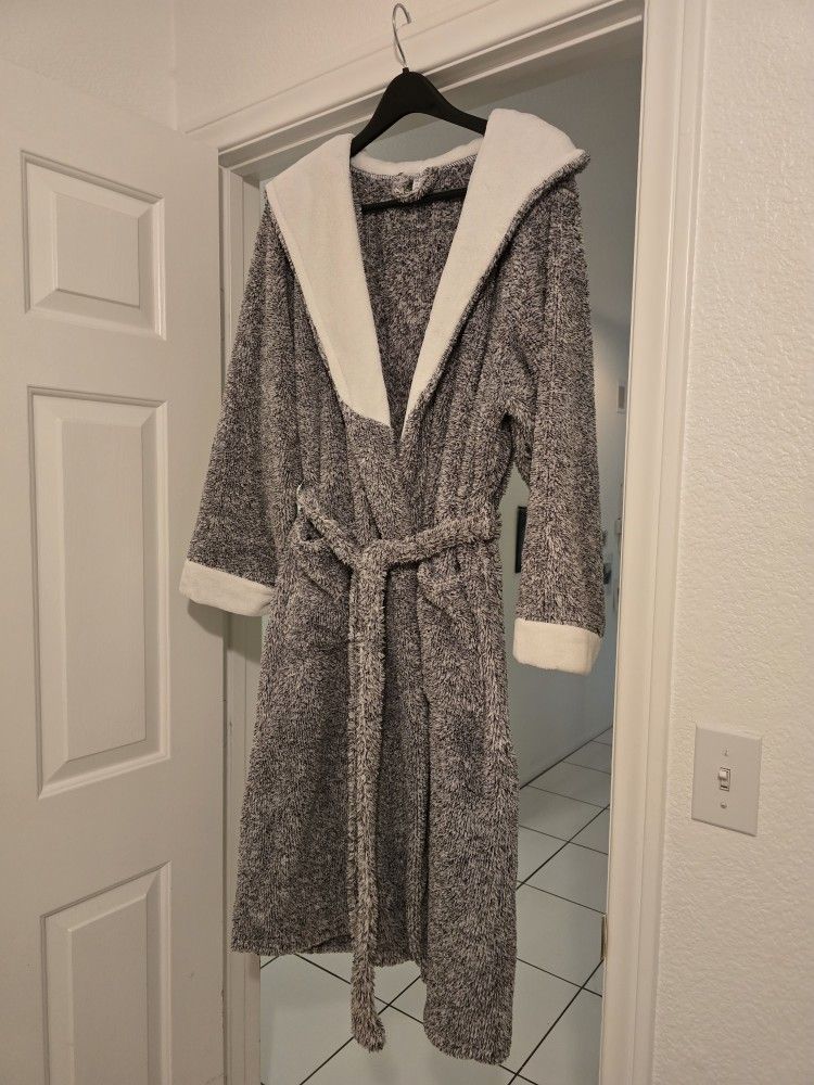 Never worn because it was from Amazon & it was too long! See all photos!!! The threads r grey& ivory very soft Has a large hood