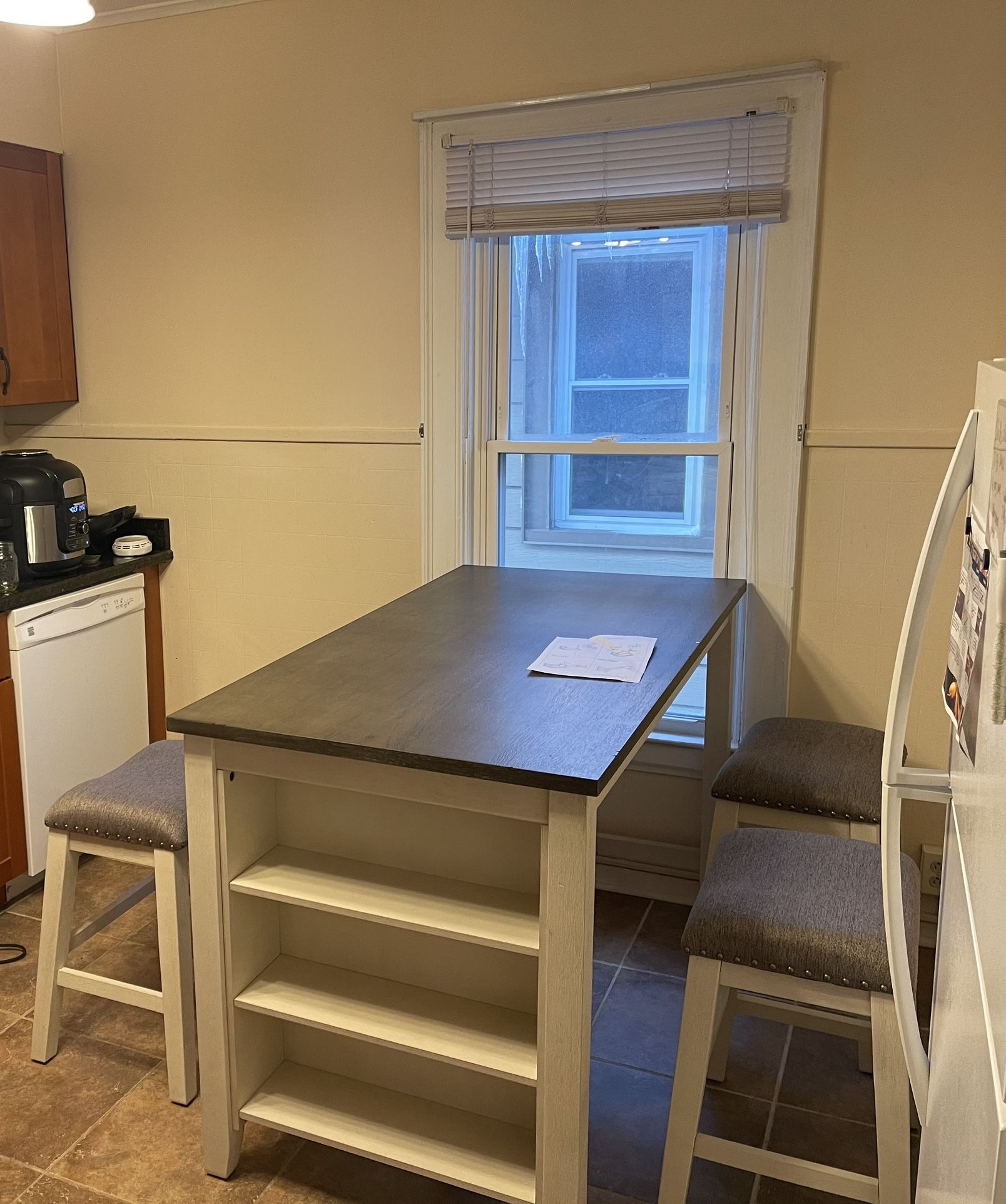 Table is no longer put together. Selling in pieces. Length: ~48 inches • Width/Depth: ~30 inches • Height: ~36 inches (counter-height) • Shelf depth: ~12–14 inches • Knee clearance (seating side): ~12–15 inches Counter-height island table designed for: • 2 stools on each side • Storage shelves on the other • Compact kitchens or eat-in nooks