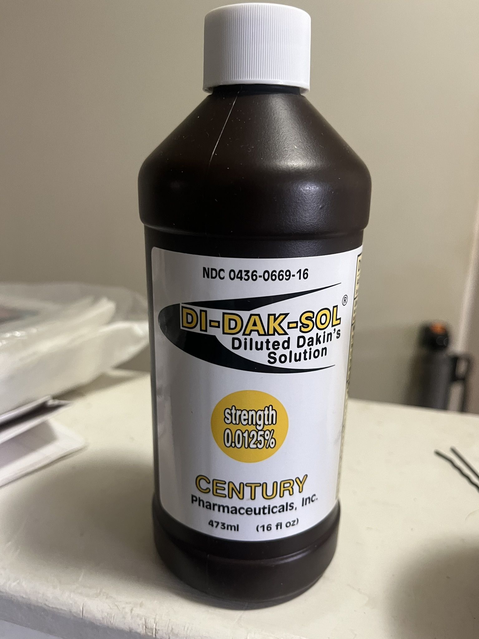 Strength .0125% a diluted Dakin's solution that can be used to treat and prevent infections on the skin and wounds