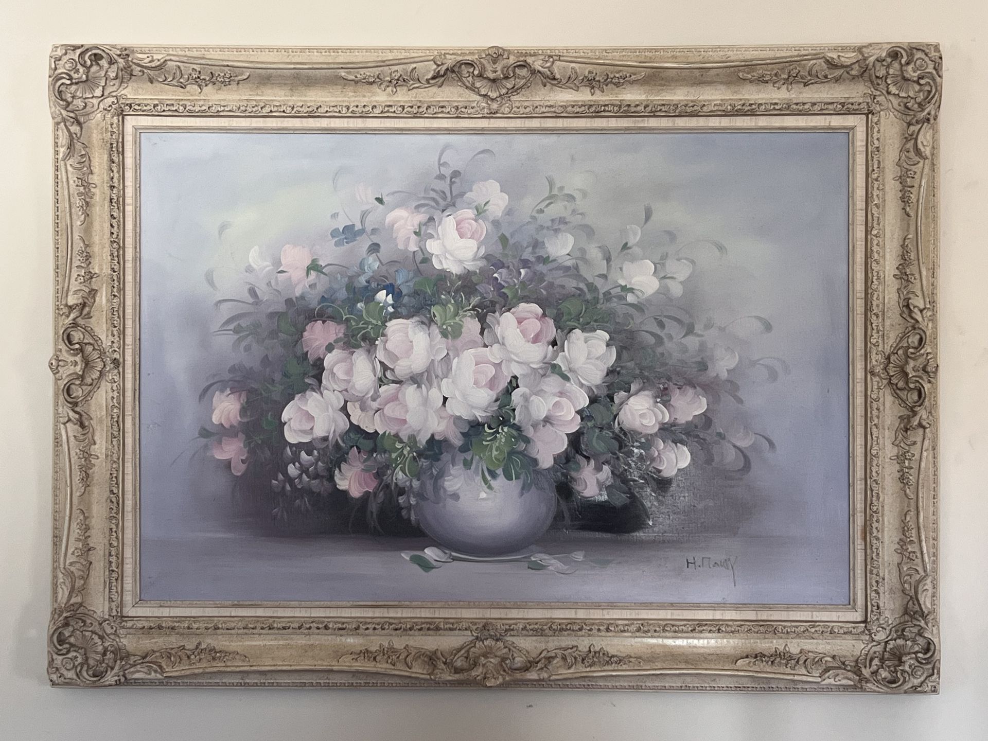 Beautiful floral oil painting with ornate wood carved frame. The painting is 44 inches wide and 32 inches high.